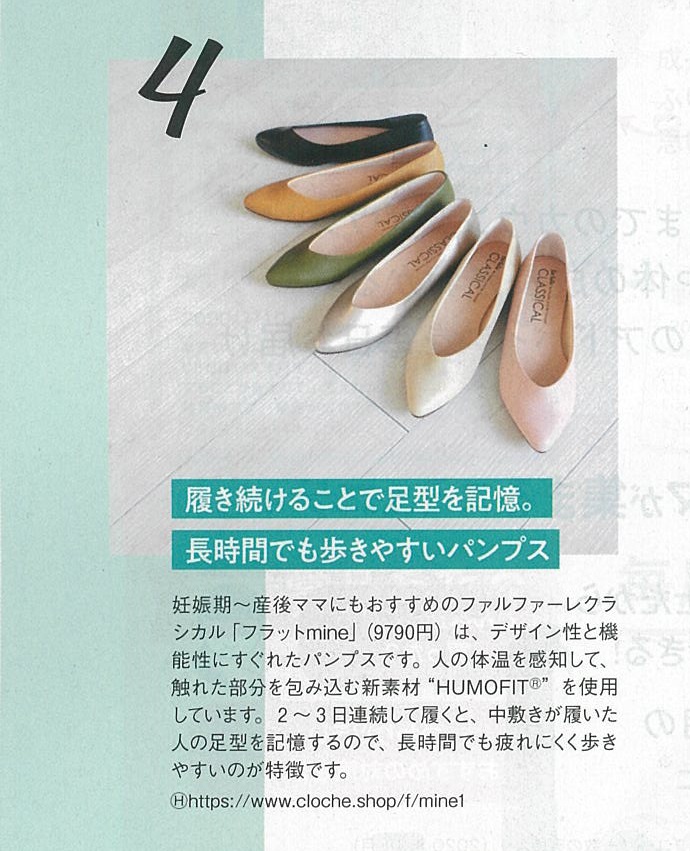 たまひよに掲載された、フラットマインはたくさん歩いても疲れづらい、体圧分散する形状記憶シート・ヒューモフィット入りのフラットパンプスです。