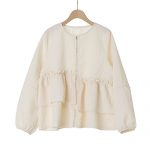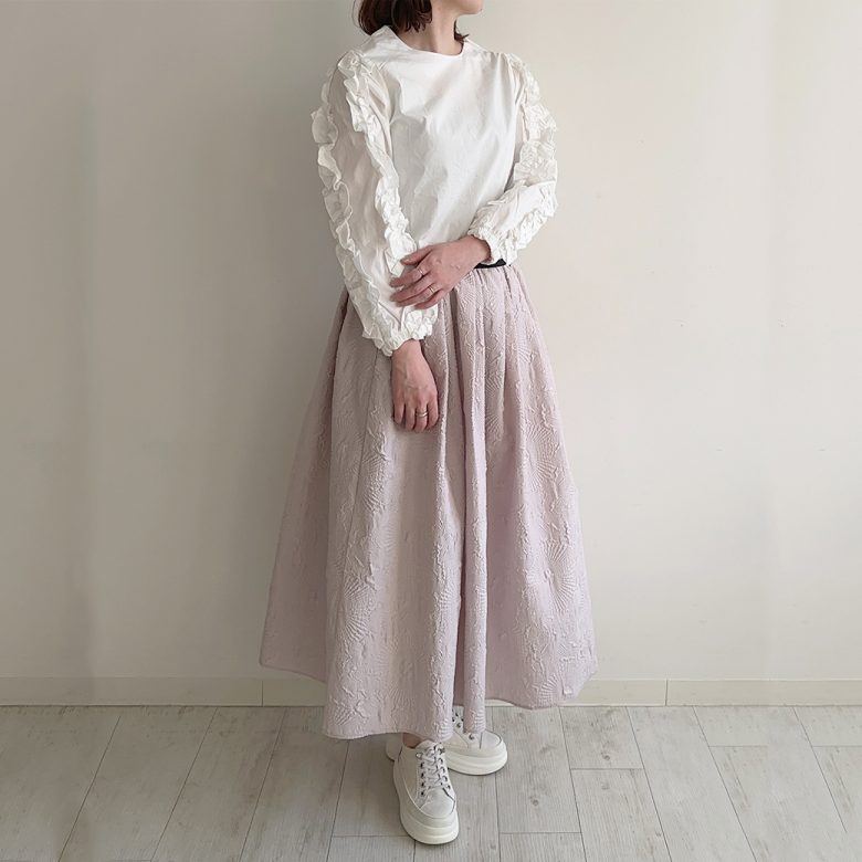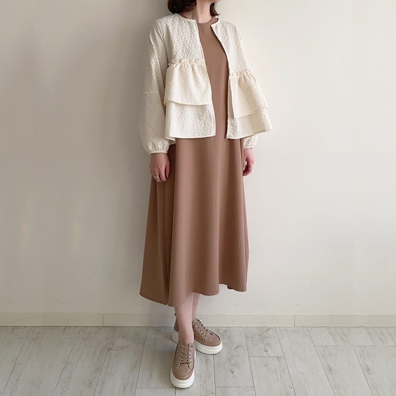 春らしい素材感とデザインのエンボスフリルジャケットを合わせて、程よい甘さをプラス。