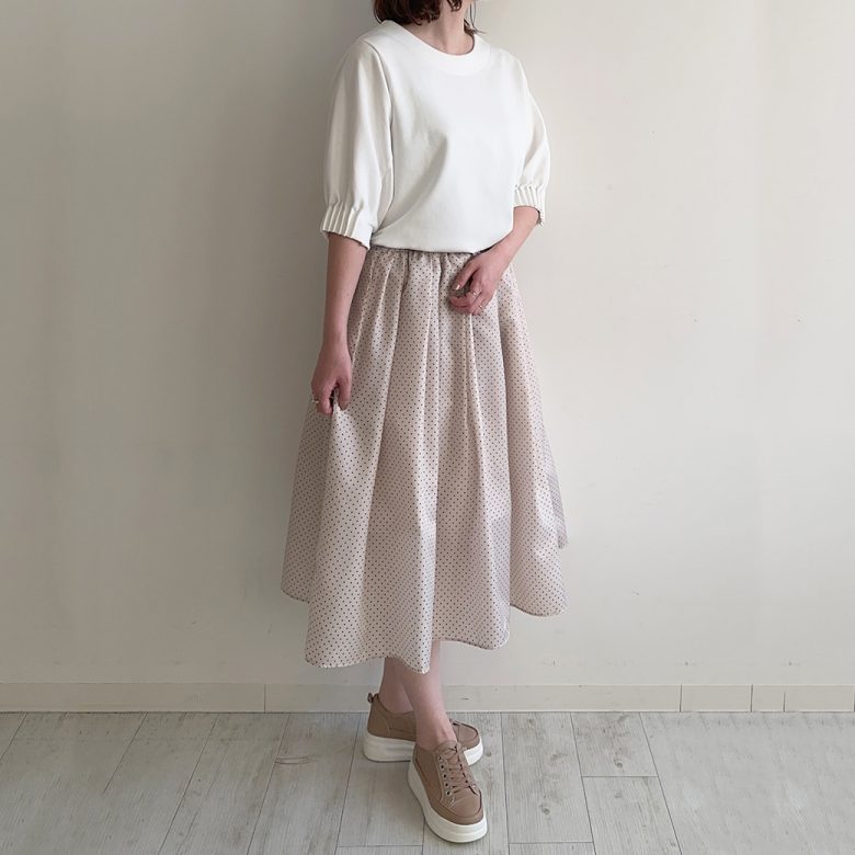 スカートは、明るめのベージュカラーを合わせると統一感も出て春らしさも◎