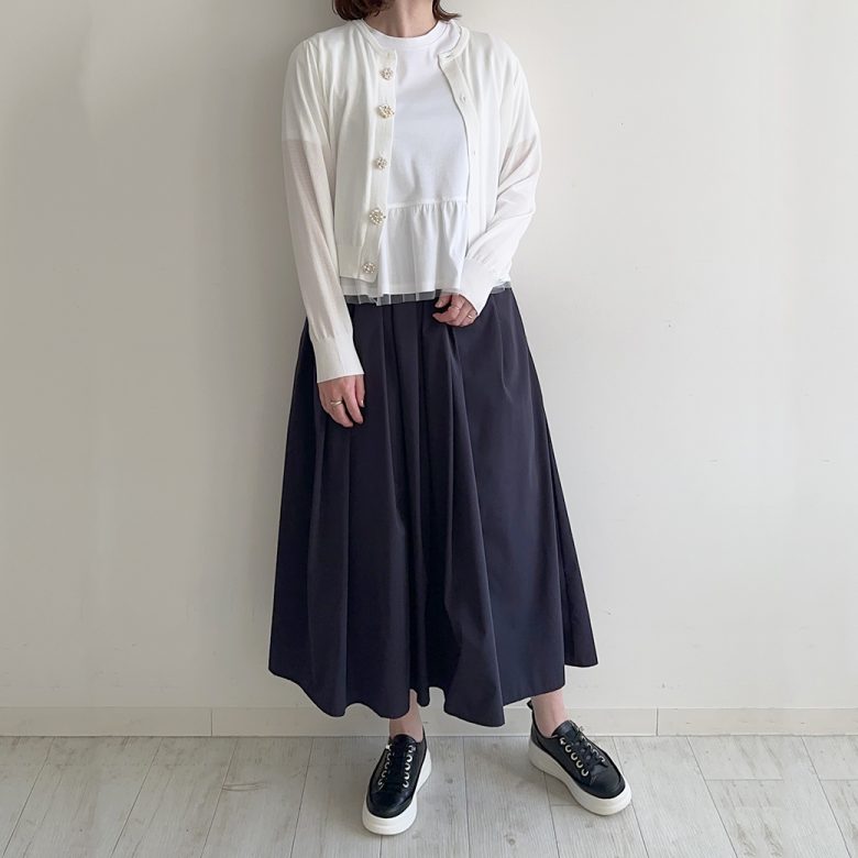 スカートとスニーカーがダークトーンなので、カーディガンとトップスは白にすることでコーデがあか抜けて見えます。