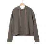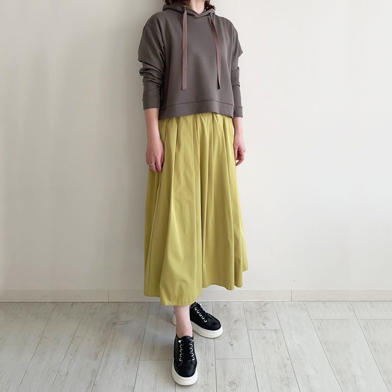 フードプルオーバーにミモザカラーのスカートを合わせたきれいめカジュアルコーデ。