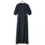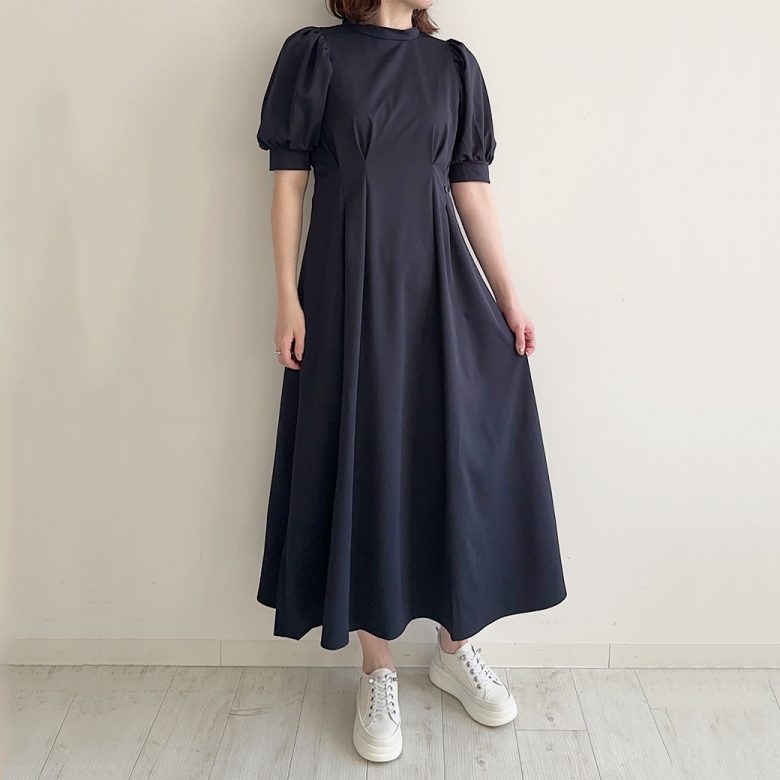 シックで女性らしいワンピースに、白のスニーカーを合わせたきれいめカジュアルスタイル。