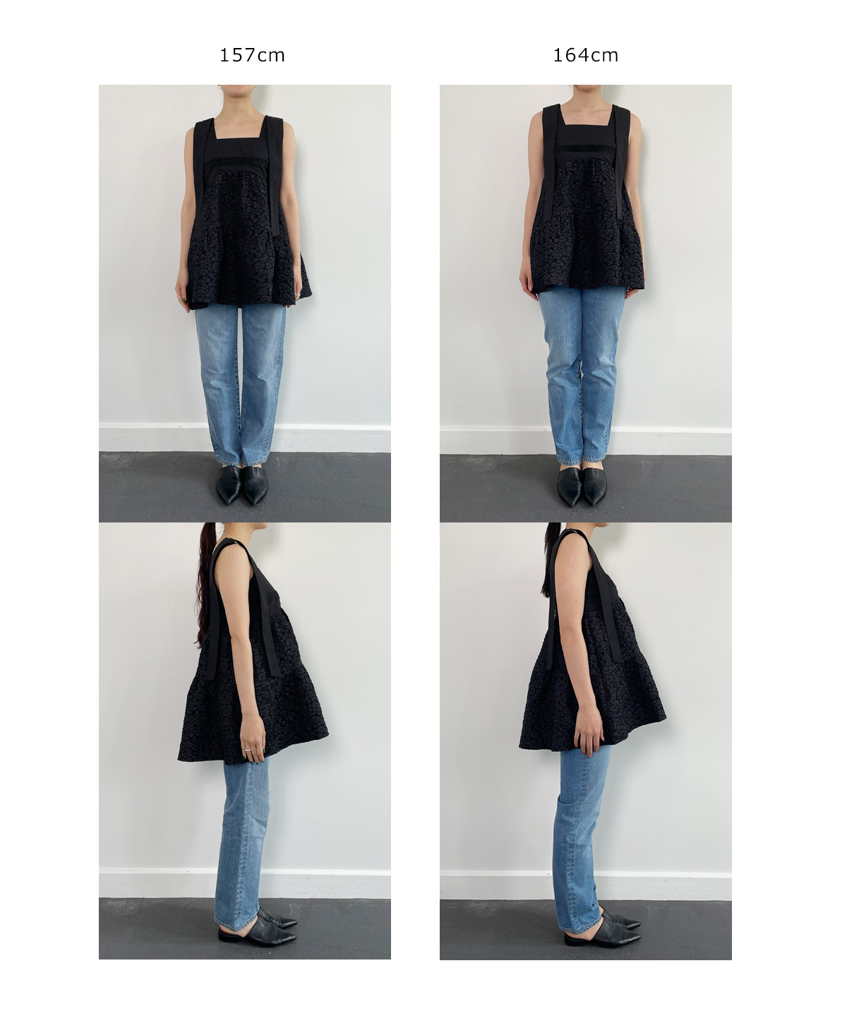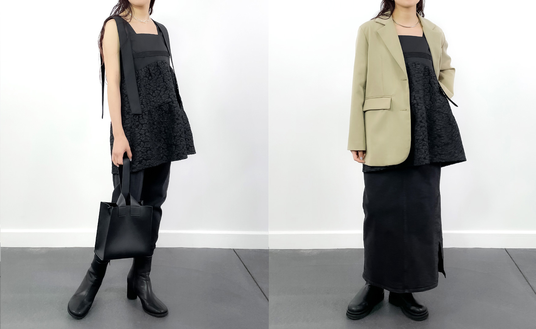 ブラックコーデのクールさの中に、エンボス生地でフレアなシルエットの甘さをMIXしたコーディネートも。 ジャケット合わせできれいめコーディネートや、華やかなフォーマルシーンなどにも着回せます。