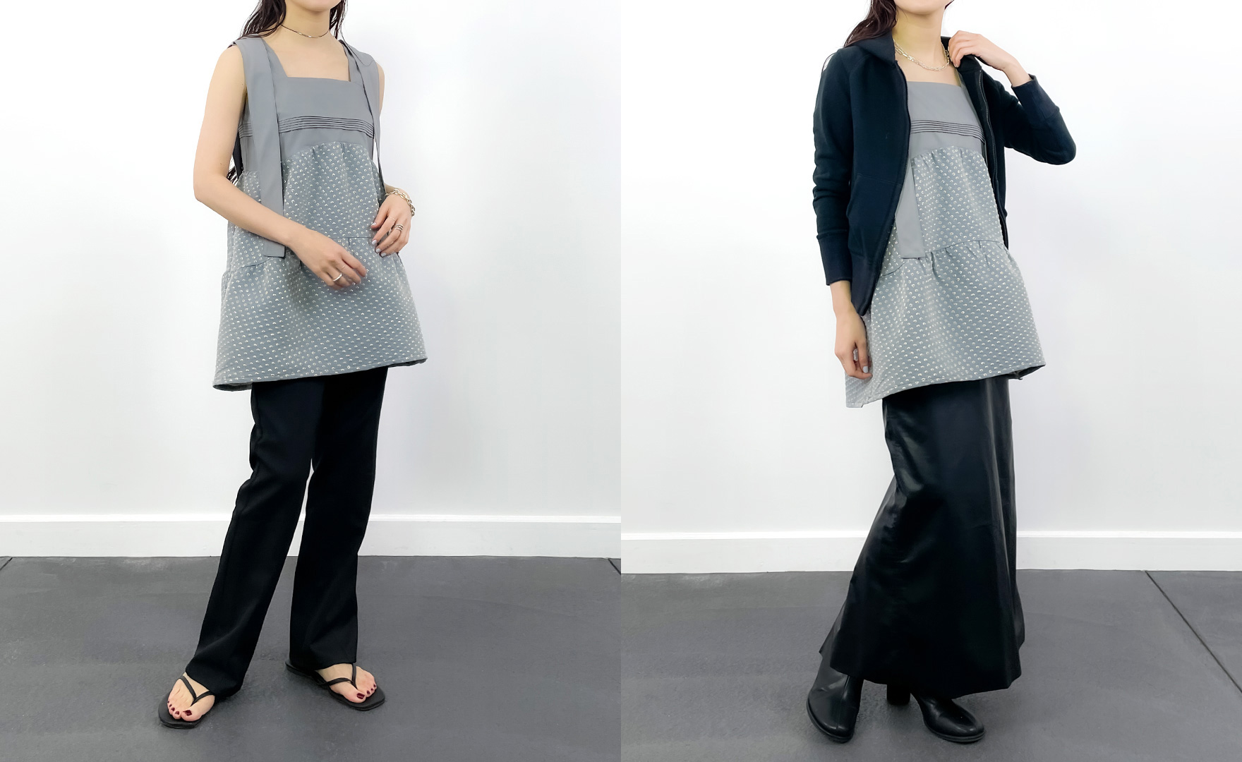 夏は一枚で着て涼し気なスタイルに。肌寒い日にはパーカーやコートなどを羽織っても。 オールシーズンさまざまなコーディネートを楽しんでいただける一着です。