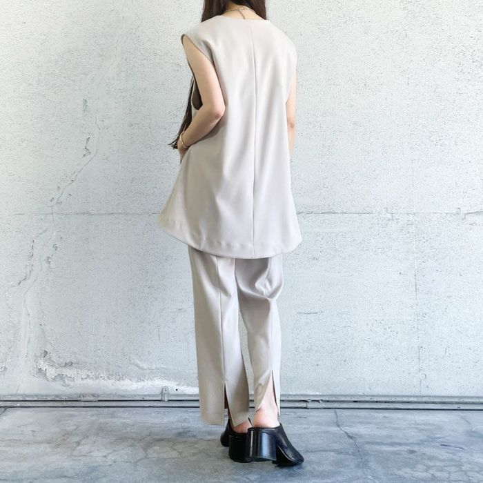 さらっとした素材感とストレッチが効いているので履きやすく、ウエストも内側のゴム仕様なので見た目はスッキリ。裾の後ろスリットもアクセントに◎