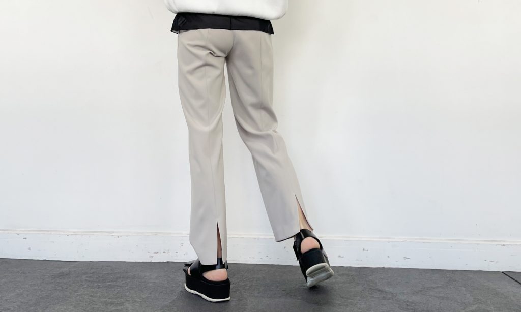 ウォッシャブルでシワになりにくく、ストレッチが効いていて穿き心地の良いバックスリットパンツ。