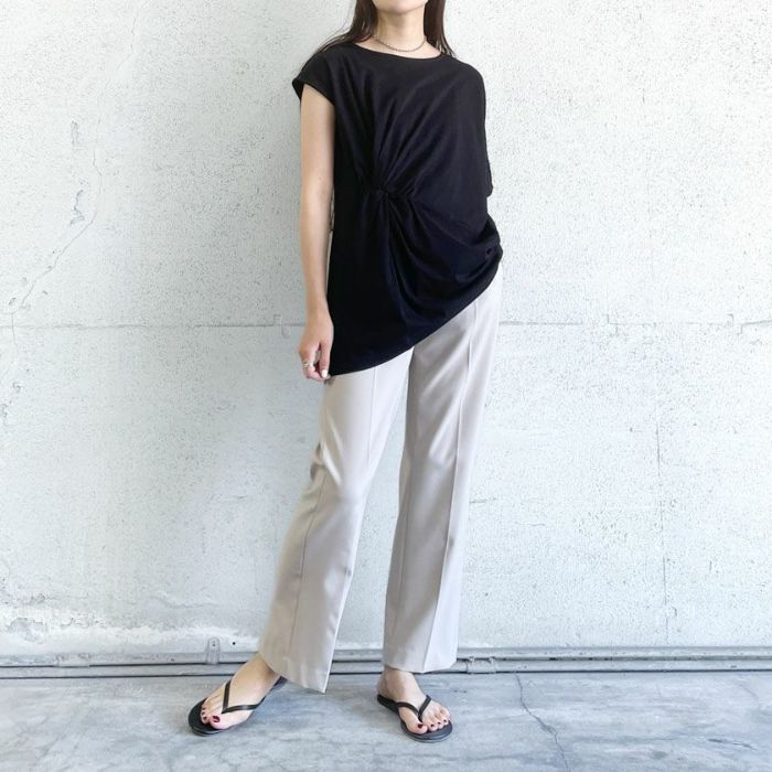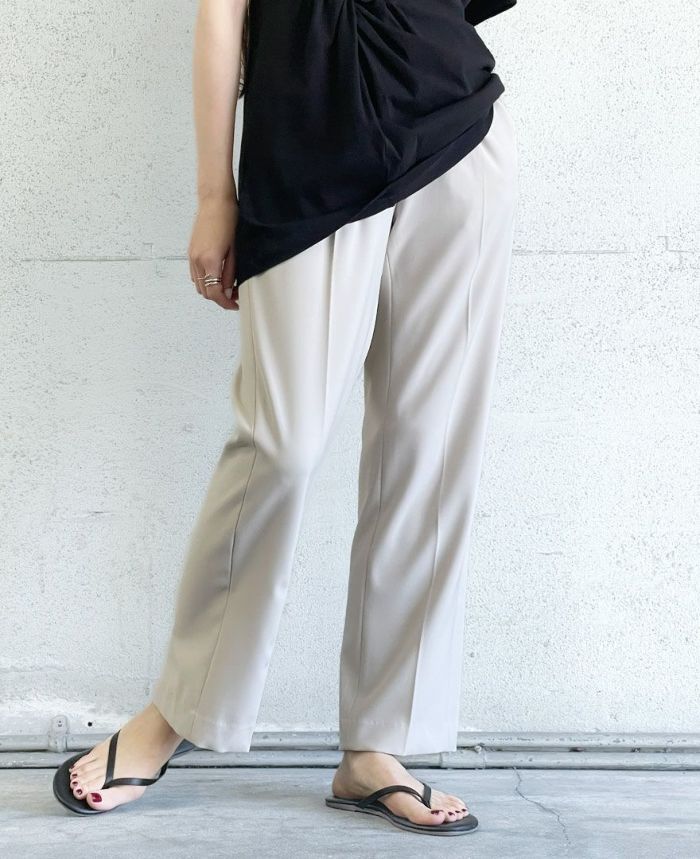 さらっとした素材感とストレッチが効いているので履きやすく、ウエストも内側のゴム仕様なので見た目はスッキリ。裾の後ろスリットもアクセントに◎