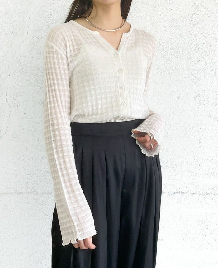 透け感とプリーツのような変形リブ編みが特徴のニットカーディガン。