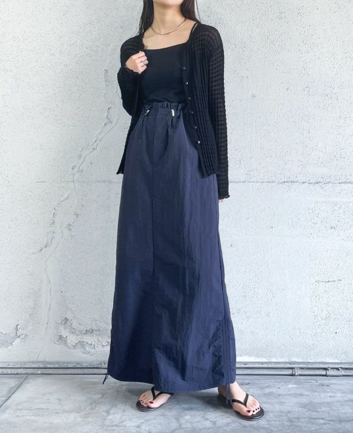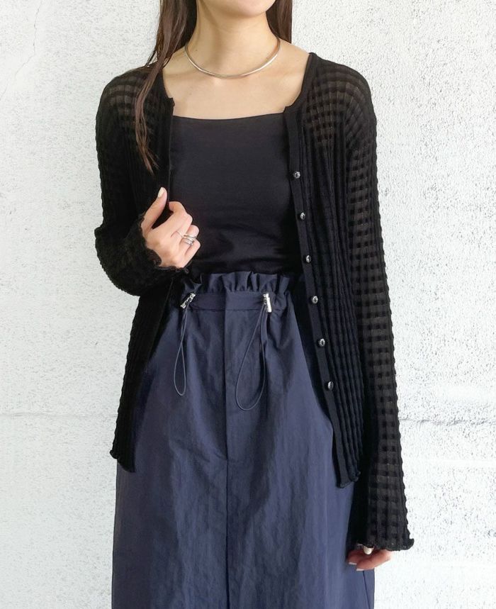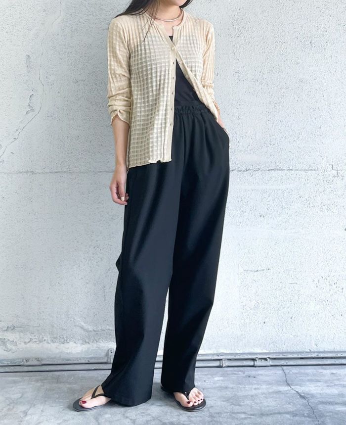 プリーツのような風合いと透け感が特徴のニットカーディガンは、主役トップスとしてカーディガンやプルオーバー使いで楽しんでいただけます。