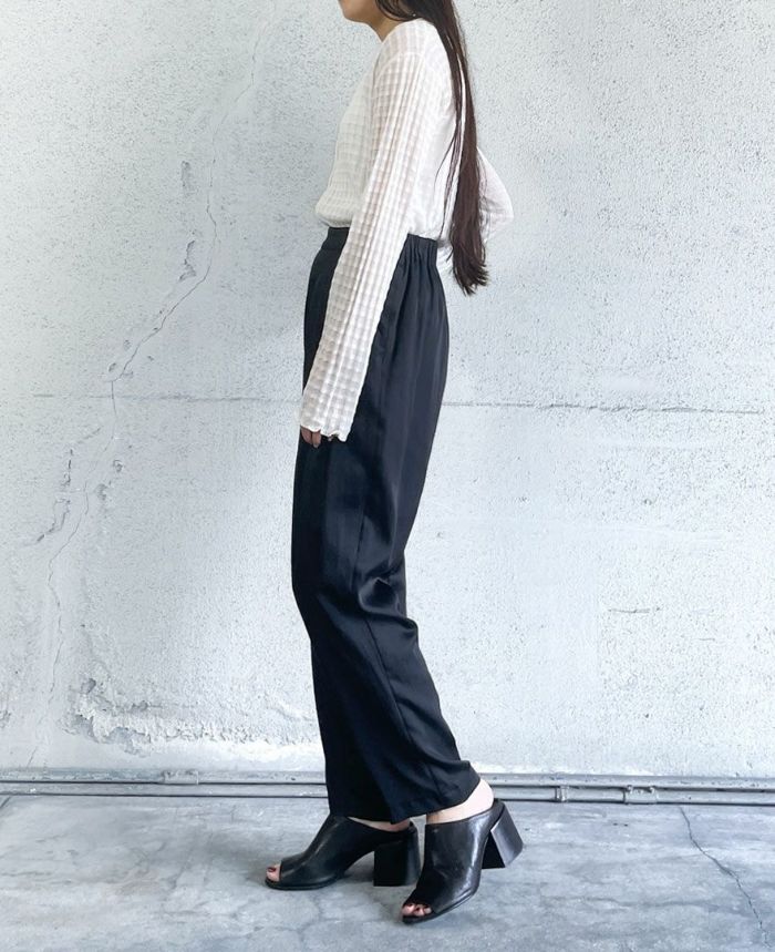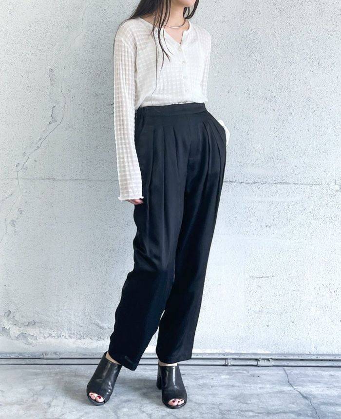 プリーツのような表面感と、袖口と裾のメロー加工が可愛く、ボタンを全部閉めた時も首元のスキッパーデザインがアクセントになります。