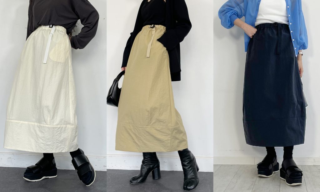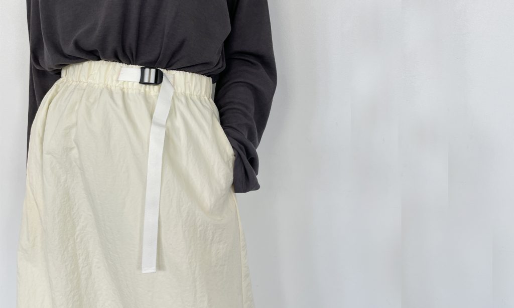 リサイクルナイロンを使用したサステナブル素材のコクーンナイロンスカート。