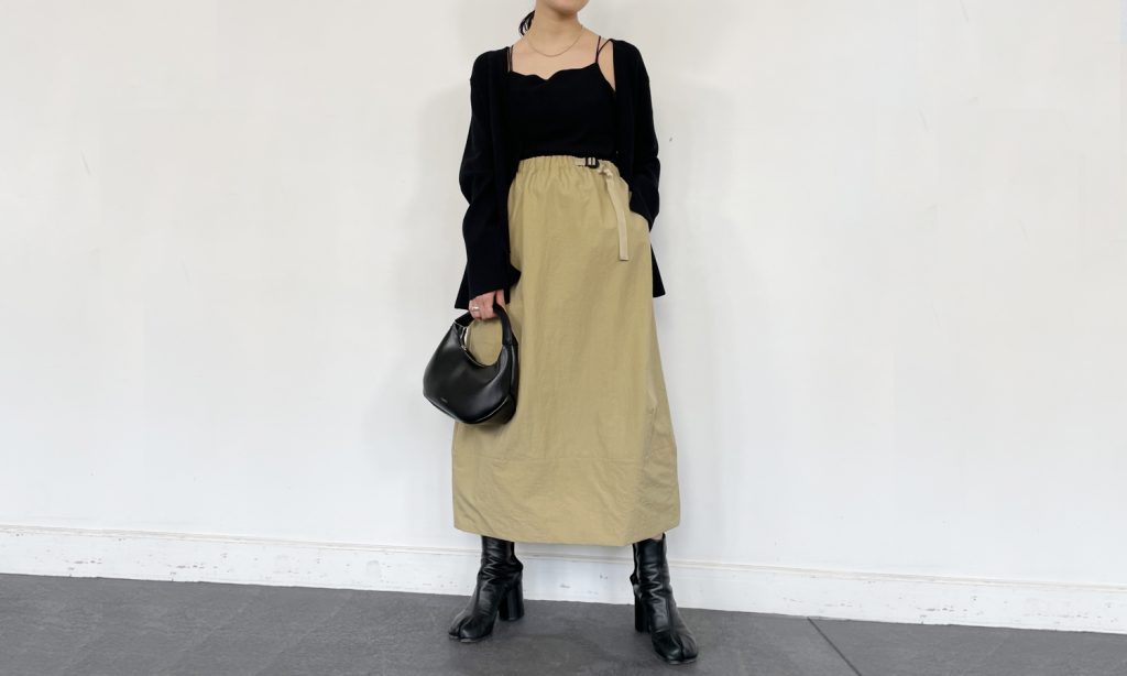 裾に向けてやや丸みのあるコクーンシルエットで柔らかさを出しつつ、ベルトデザインやナイロン素材でスポーティーさもプラスした1枚です。