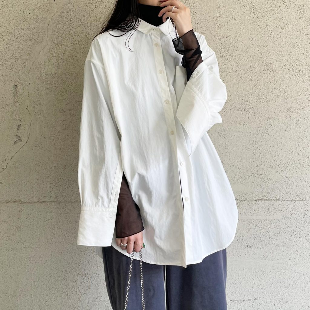 シンプルなオーバーサイズデザインでオンオフ問わず着られてどんなコーディネートとも合わせやすく、袖下のボタンの開閉でスリット仕様になりデザイン性のある1枚◎