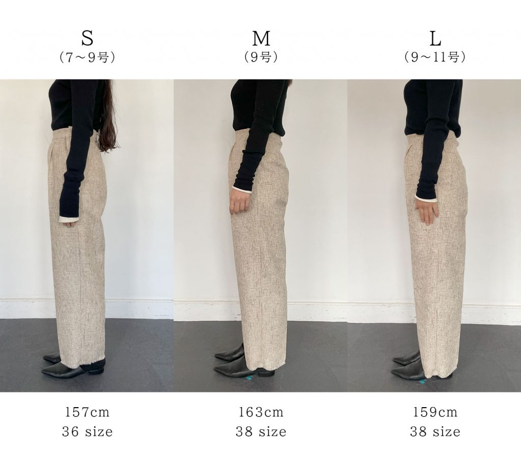 トレンドのツイード素材ですが、同色系の糸とフリンジ加工、セミワイドなシルエットで、かしこまり過ぎず程よくラフに着られます。それでいて立体的なシルエットがとてもキレイ!