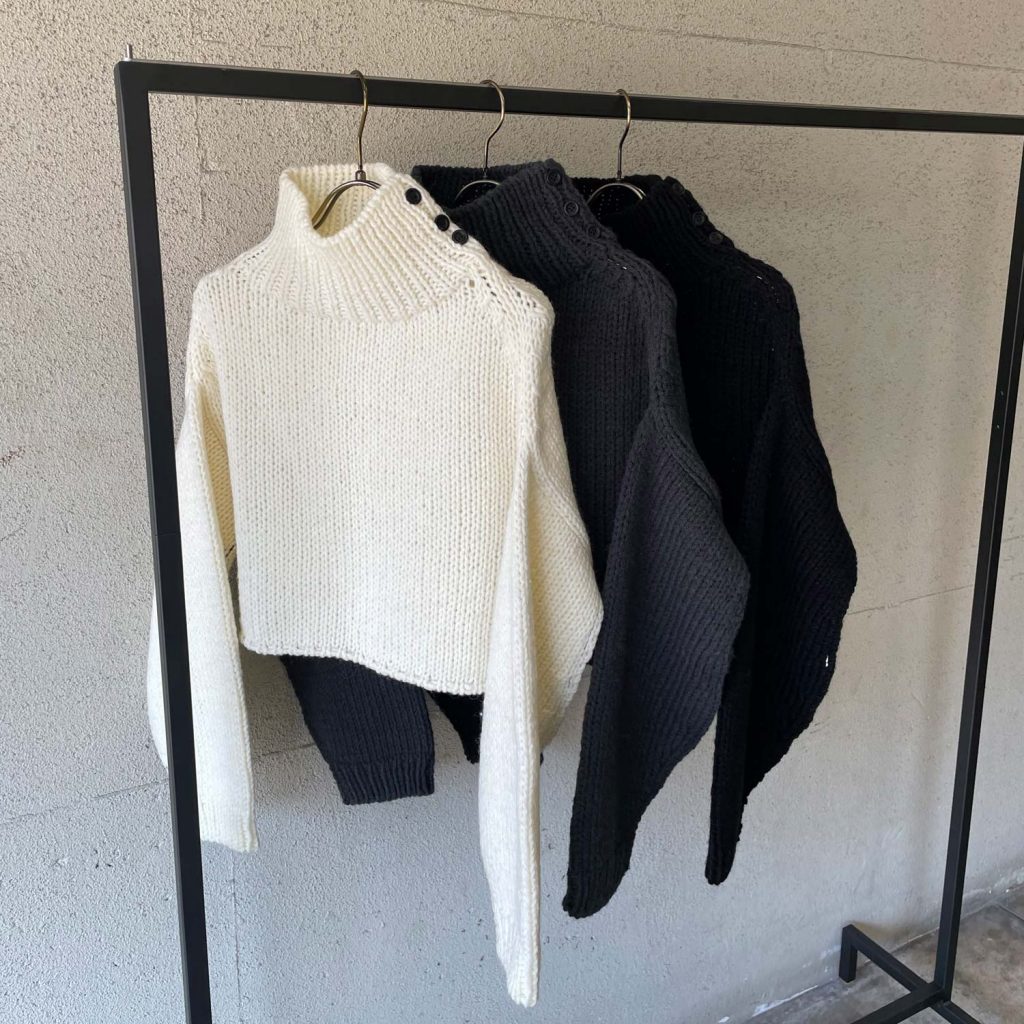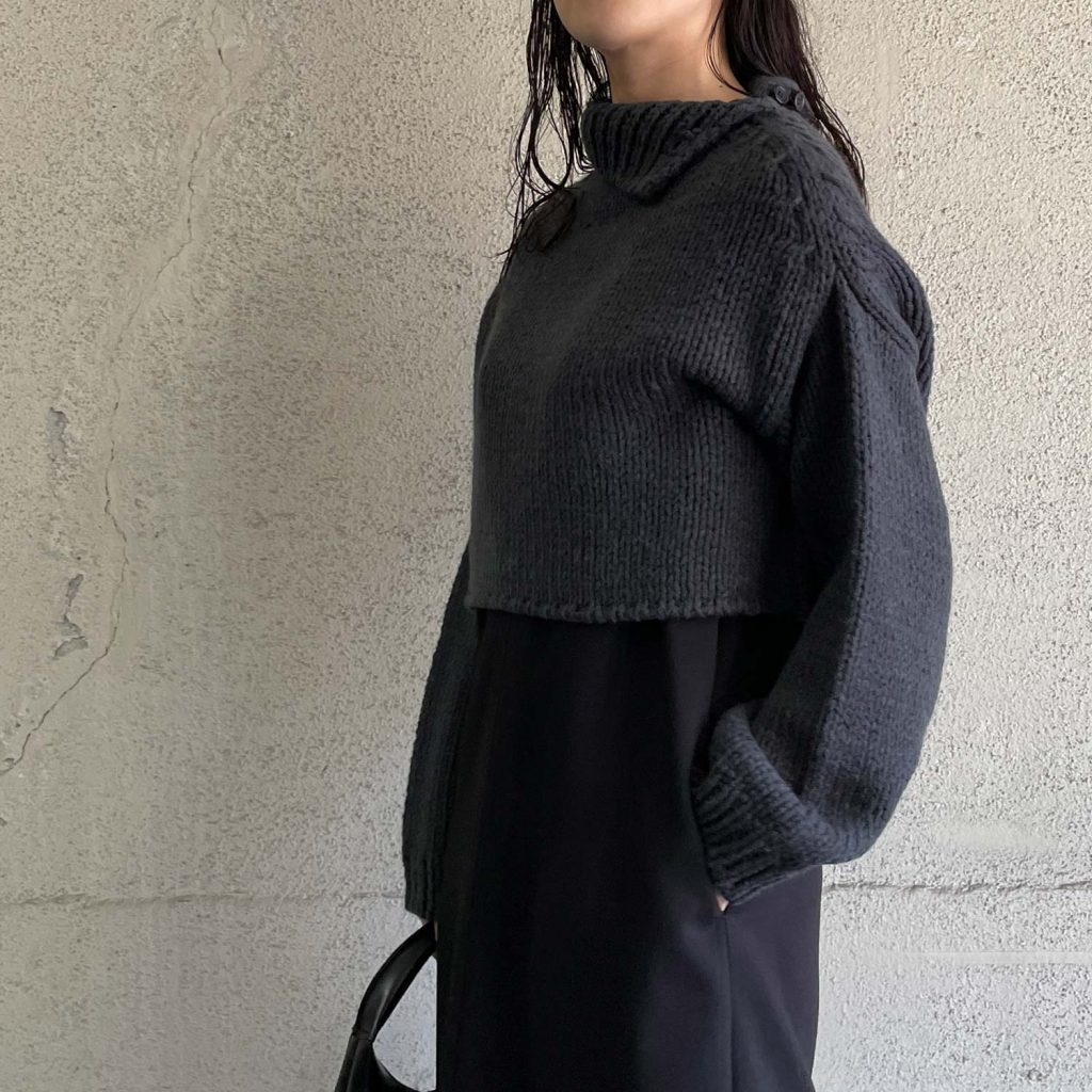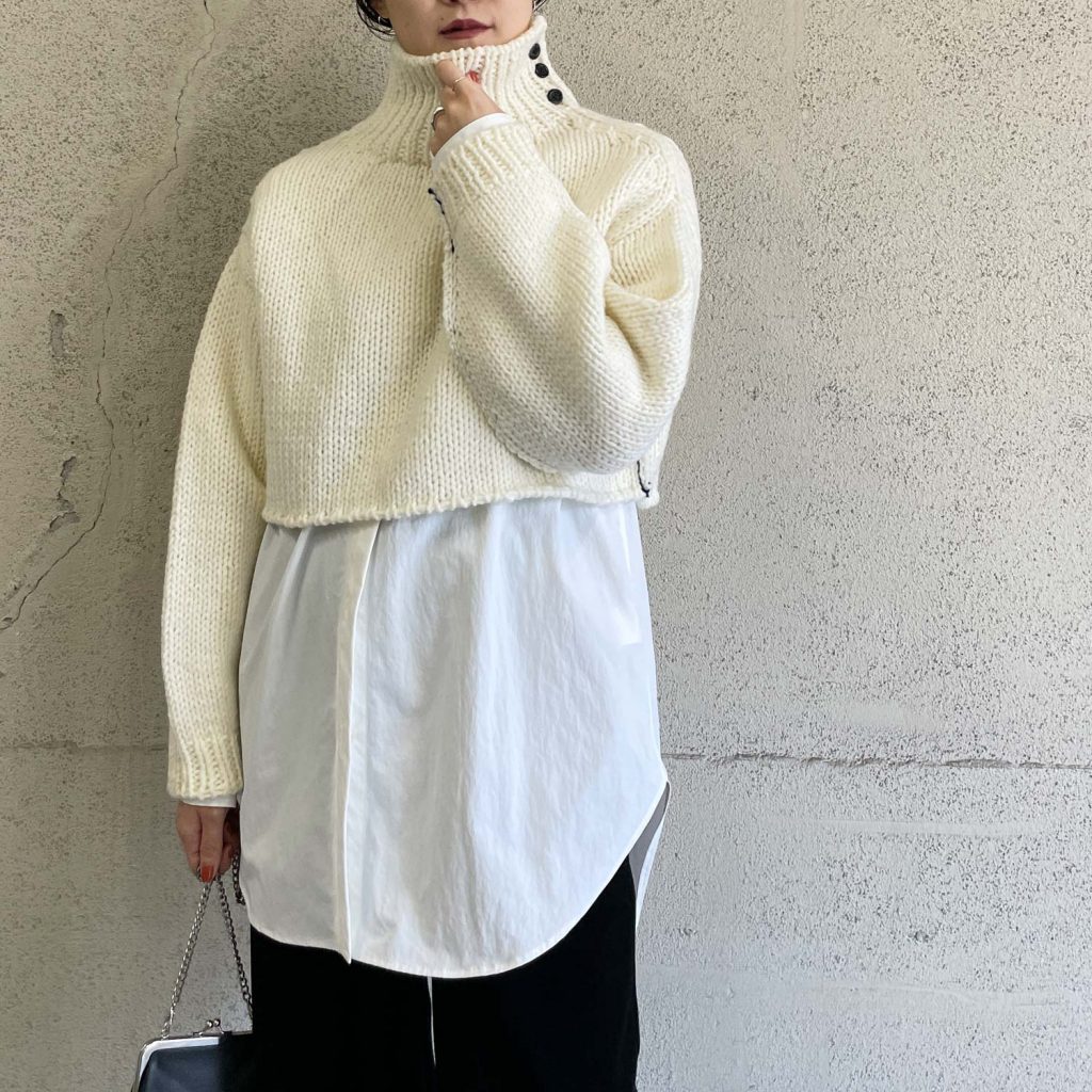 袖のボリュームとショート丈のシルエットが特徴のハンドメイドニット。