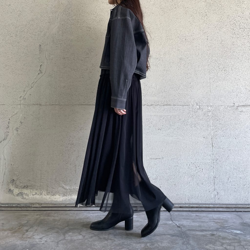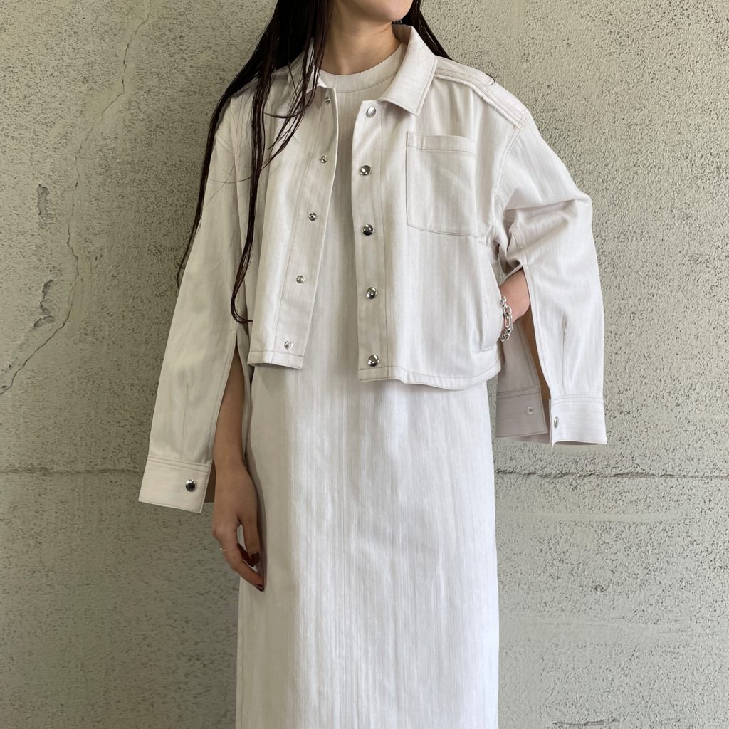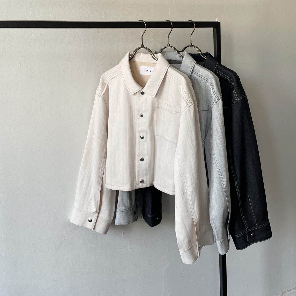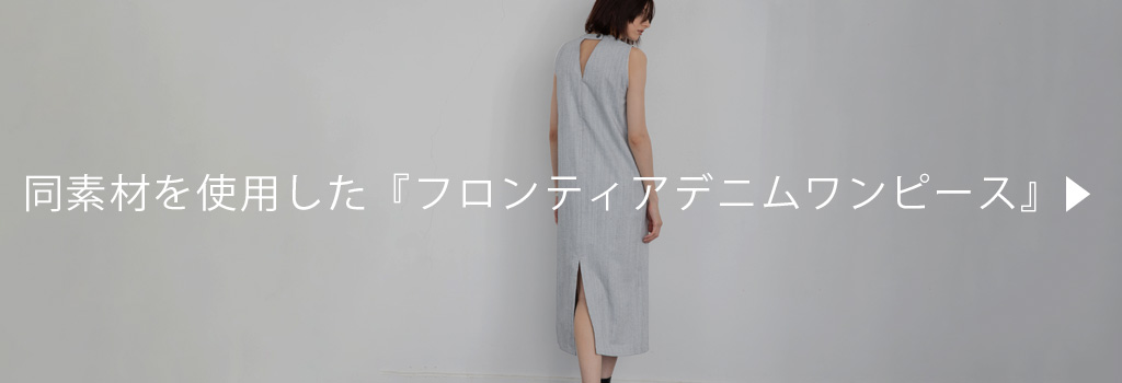 カラーは『ivory / lightgray / black』の3色展開。 肉厚すぎず、適度にハリのあるデニム素材を使用 ストレッチ性のある素材でムラ感のある色味に仕上げ、肩と背面部分の断ち切りデザインは大人の女性が着やすい程度のフリンジに。