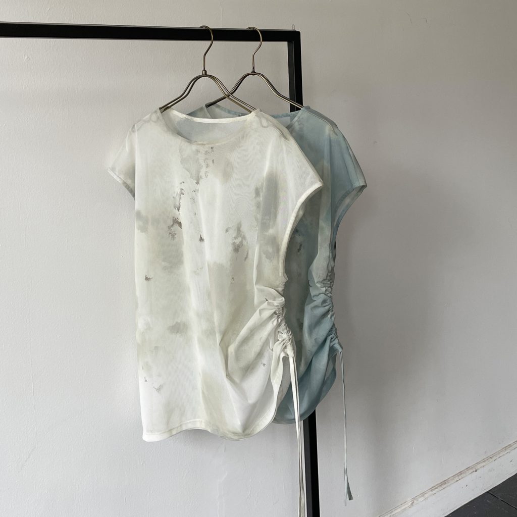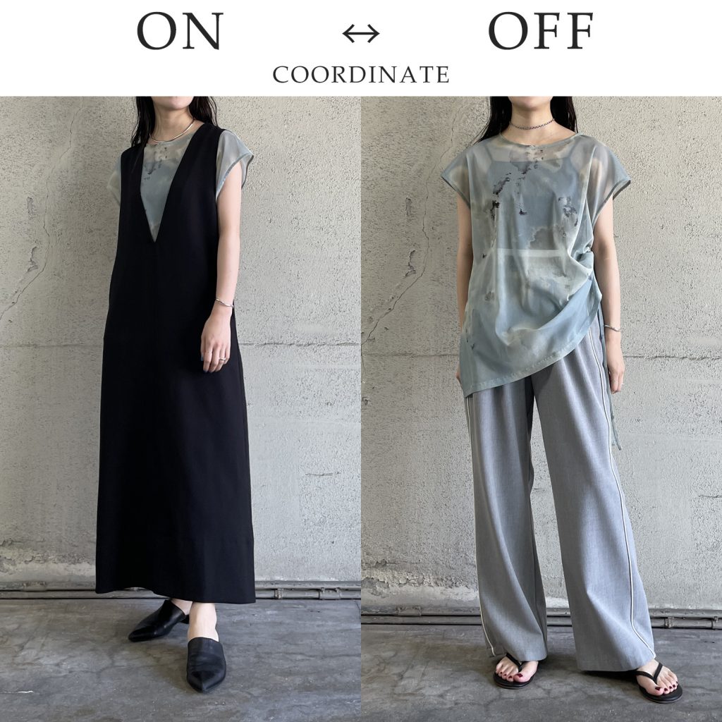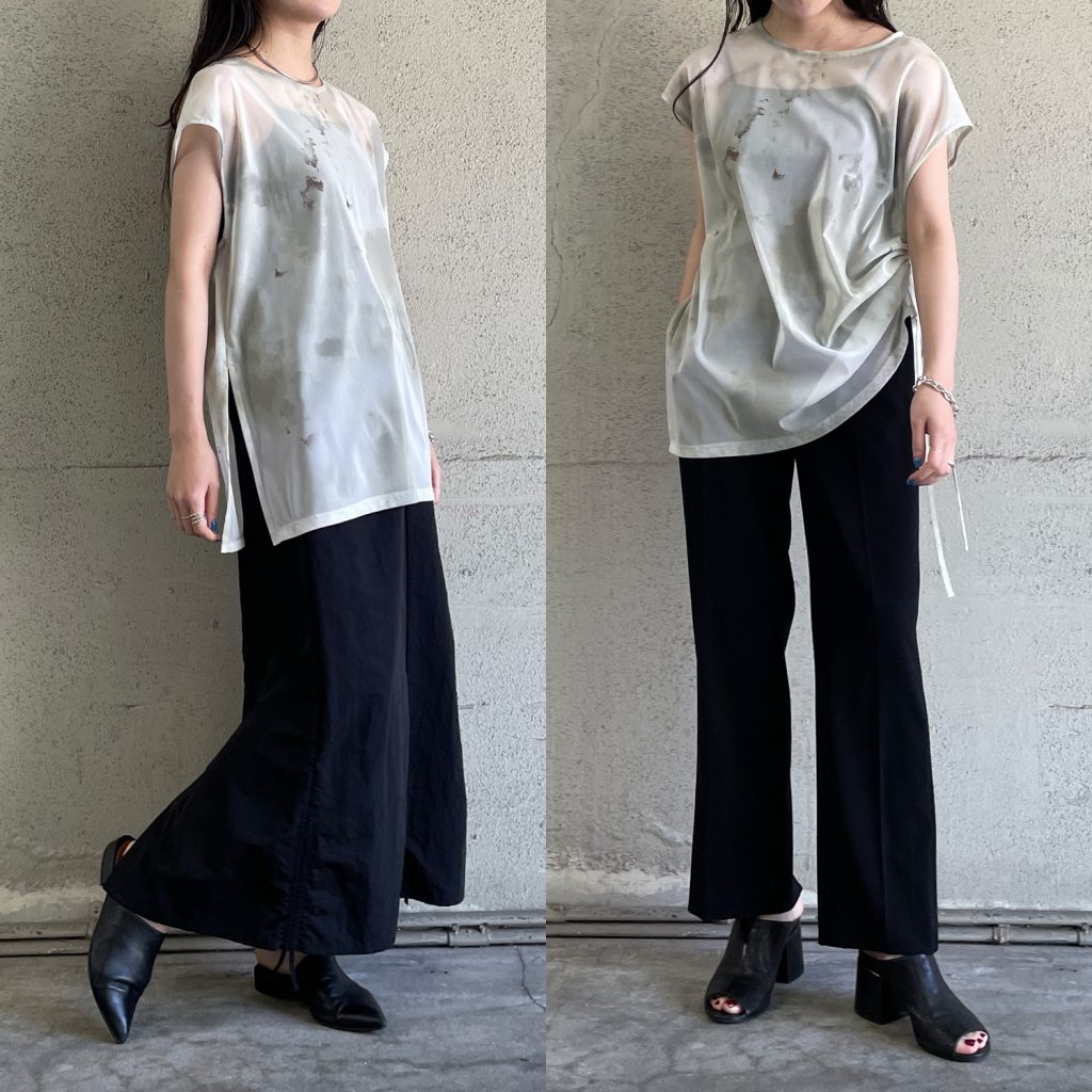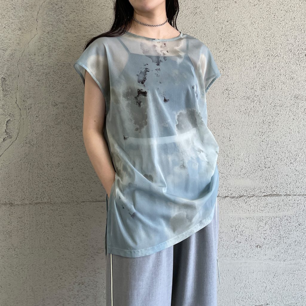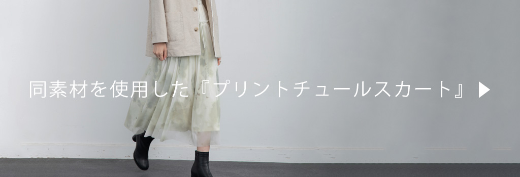 チュールのシアー感とクールなスモーク柄が、コーディネートに馴染みながらもアクセントになる1枚です。