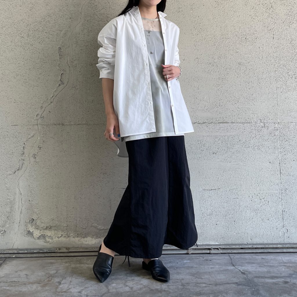 そのまま着丈長めに着用しても片側のスリットデザインで動きが出ますが、もう片側の紐を絞ってシルエットに変化をつけても◎