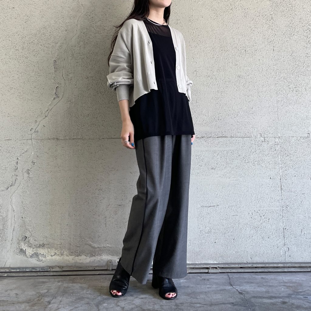 カーディガンのインナーとしてラフなパンツを合わせて普段着にも。