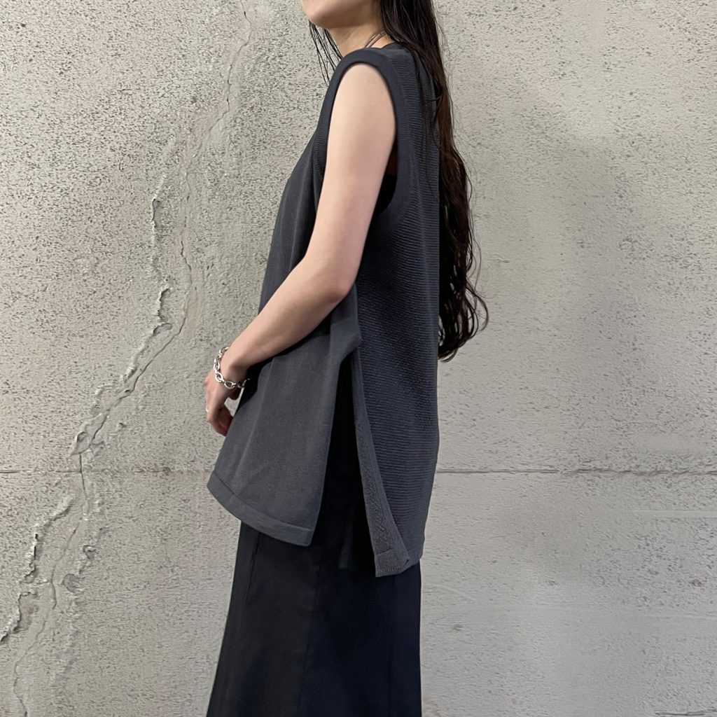 キレイ目なパンツを合わせてノースリーブのニットとしてお出かけコーディネートにも、インナーにTシャツを合わせてラフな普段着にも。