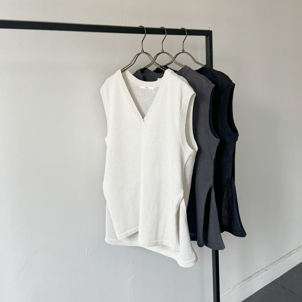 和紙混の生地を使い、前後で編地を変えたVネックオーバーベスト。