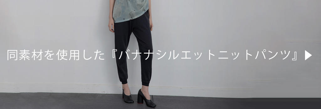 後ろの生地は、ポリエステルと和紙混の麻のようなシャリ感のある風合いの糸を前後で編地を変え、後ろはやや透け感のある編地で仕上げました。