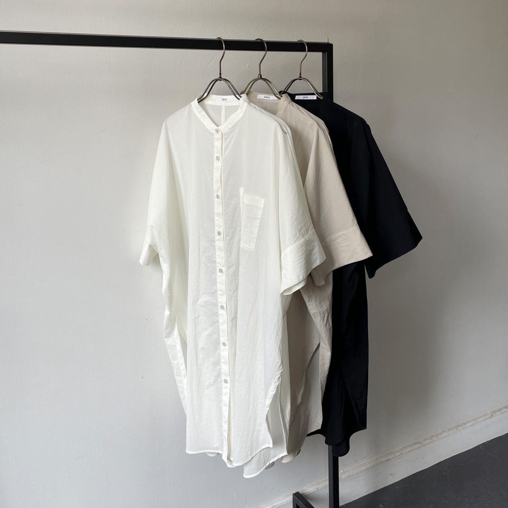 カラーは『white / greige / black』の3色展開。 軽い着心地で、リラクシーに着られる1枚 ヴィンテージライクなシボ感のある素材を使用。