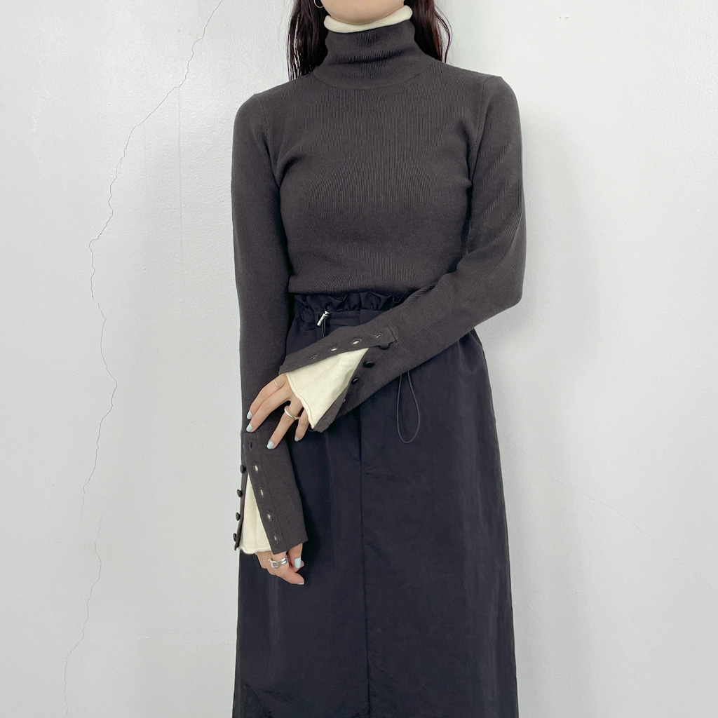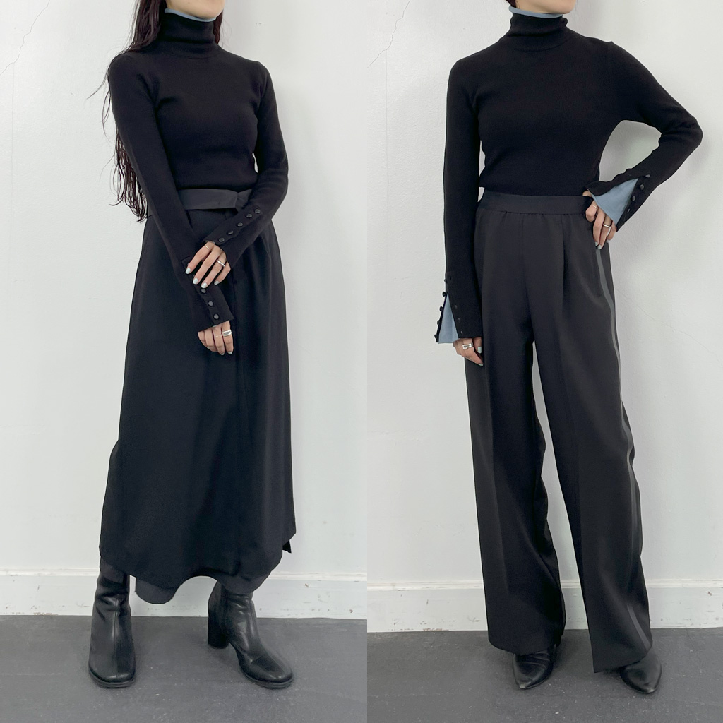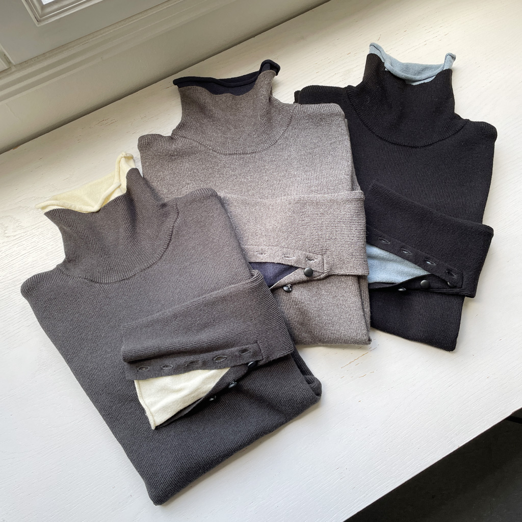 ▶Insta Liveでもご紹介しています (0:25~) 柔らかでもちもちとした素材感と、アレンジ可能な配色デザインが特徴のレイヤードデザインハイネックニット。 カラーは『グレー/スミクロ/ブラック』の3色展開。 高機能な素材と快適な着心地 抗ピリング、抗菌、防臭、静電気防止の機能がある糸を使用し、静電気の多い冬でも快適な着心地。 素肌に着てもチクチクにしくい柔らかくもちもちとした肌触りで、伸縮性も◎ グレー×ネイビー、スミクロ×アイボリー、ブラック×ライトブルーの配色に仕上げました。 手洗い可能でご自宅でお手入れが可能。 首元と袖口の配色レイヤードデザインが特徴 袖元はそのままでもボタンがアクセントになりますが、ボタンを外すとフレアなシルエットに変化し、配色が更にアクセントに。 程よい厚みなのでインナー使いにもおすすめで、ロングシーズン着回せる一着。 また、首元の表地を折り返して配色をより見せたりとバランスを変えてコーディネートを楽しめます。
