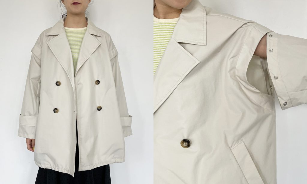 袖が取り外しできるだけでなく、裾も変えられて、機能性にも優れたENTOイチオシのトレンチコートです。