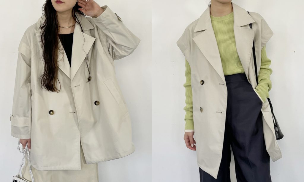 【アレンジ1】袖あり、ベストの2wayで着回し可能! ややオーバーサイズシルエットとミドル丈のトレンチコートで、スナップボタンで簡単に袖が取り外せ、袖あり・トレンチベストの2wayで着こなしをを楽しめます。