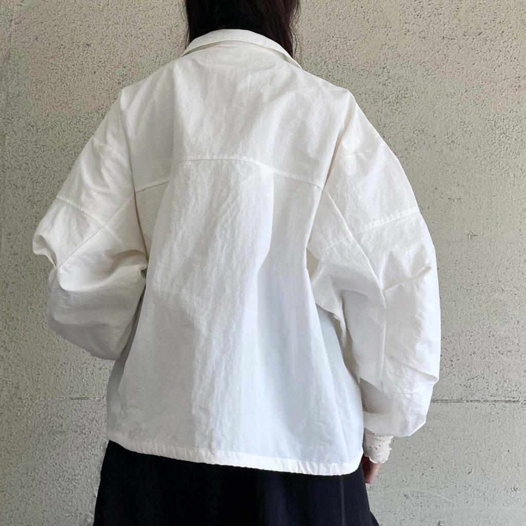 コーチジャケット風でメンズライクな雰囲気もありながら、袖と背面のボリューム感や裾を絞って更に丸みのあるシルエットにしたりと、レディーライクな印象も加えたのがポイント。