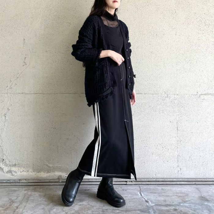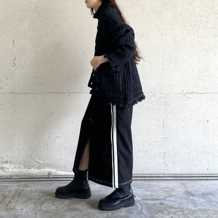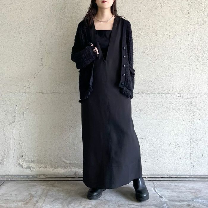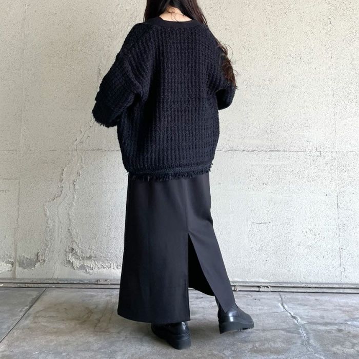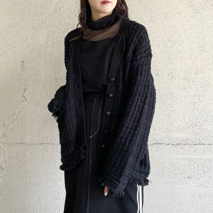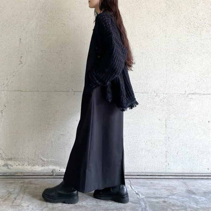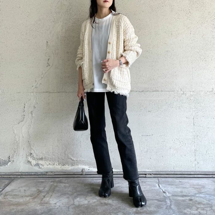 ざっくりとした編地が可愛く、ツイードのレトロ感がありながらもコットンベースなので程よくカジュアル感もあり、秋冬春と羽織としてロングシーズン活躍するアイテム。
