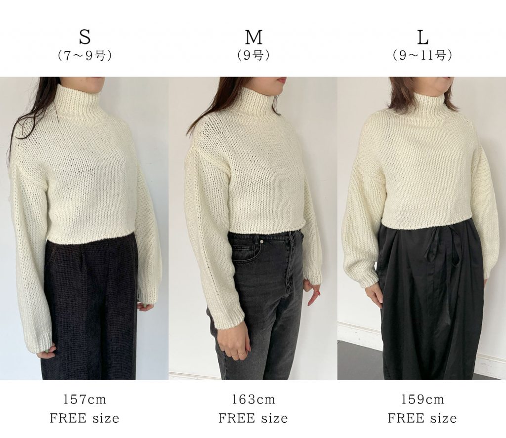 袖のボリュームとショート丈のシルエットが特徴のハンドメイドニット。