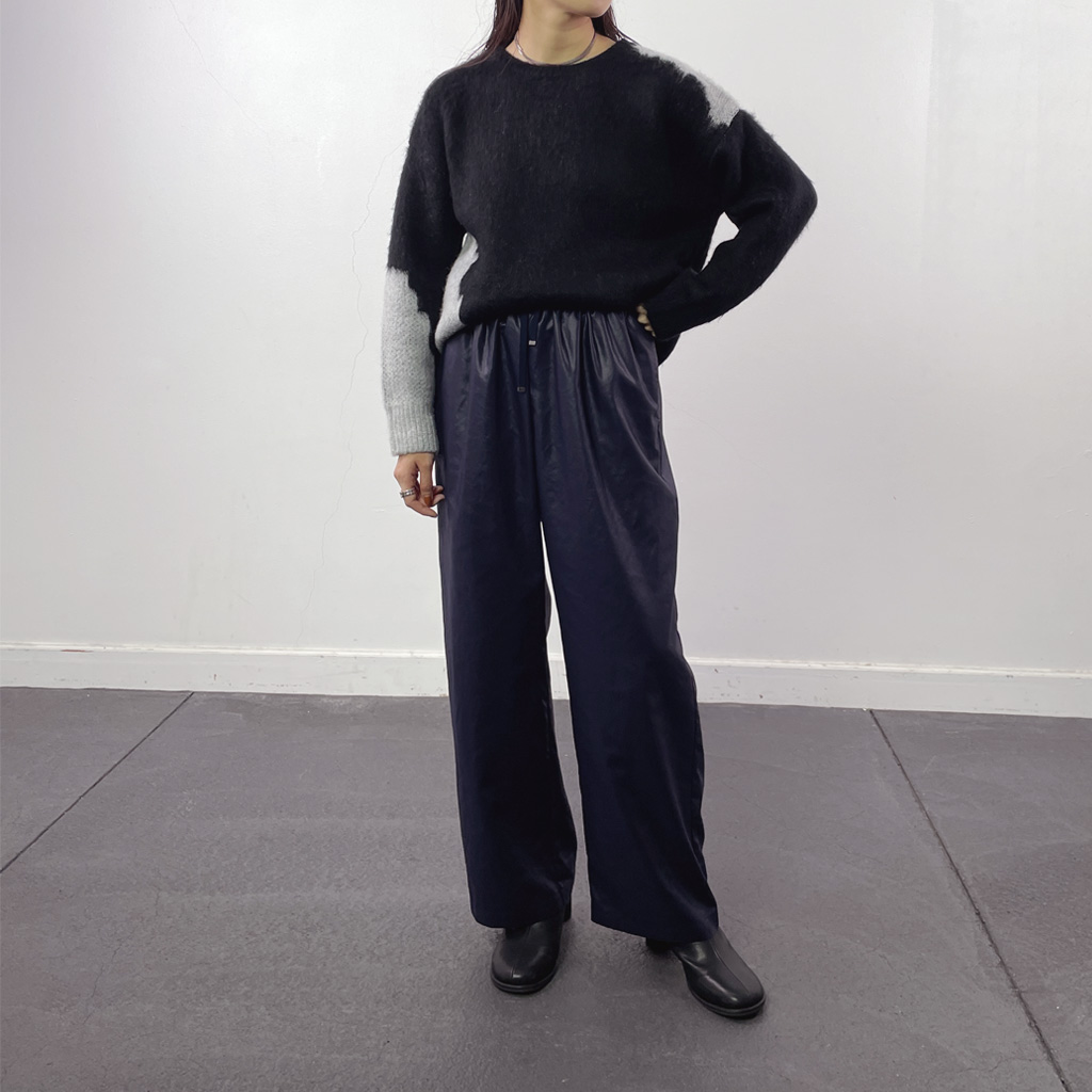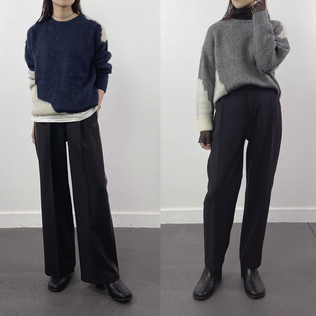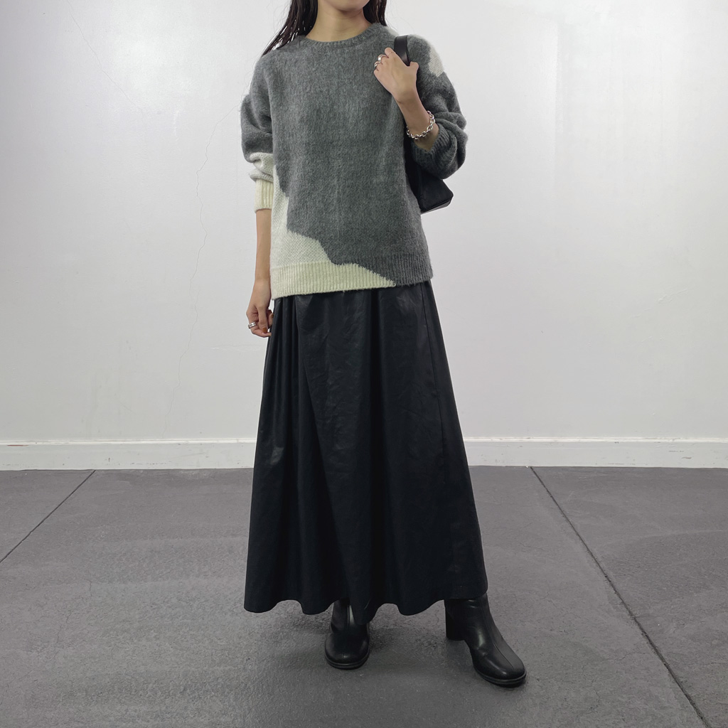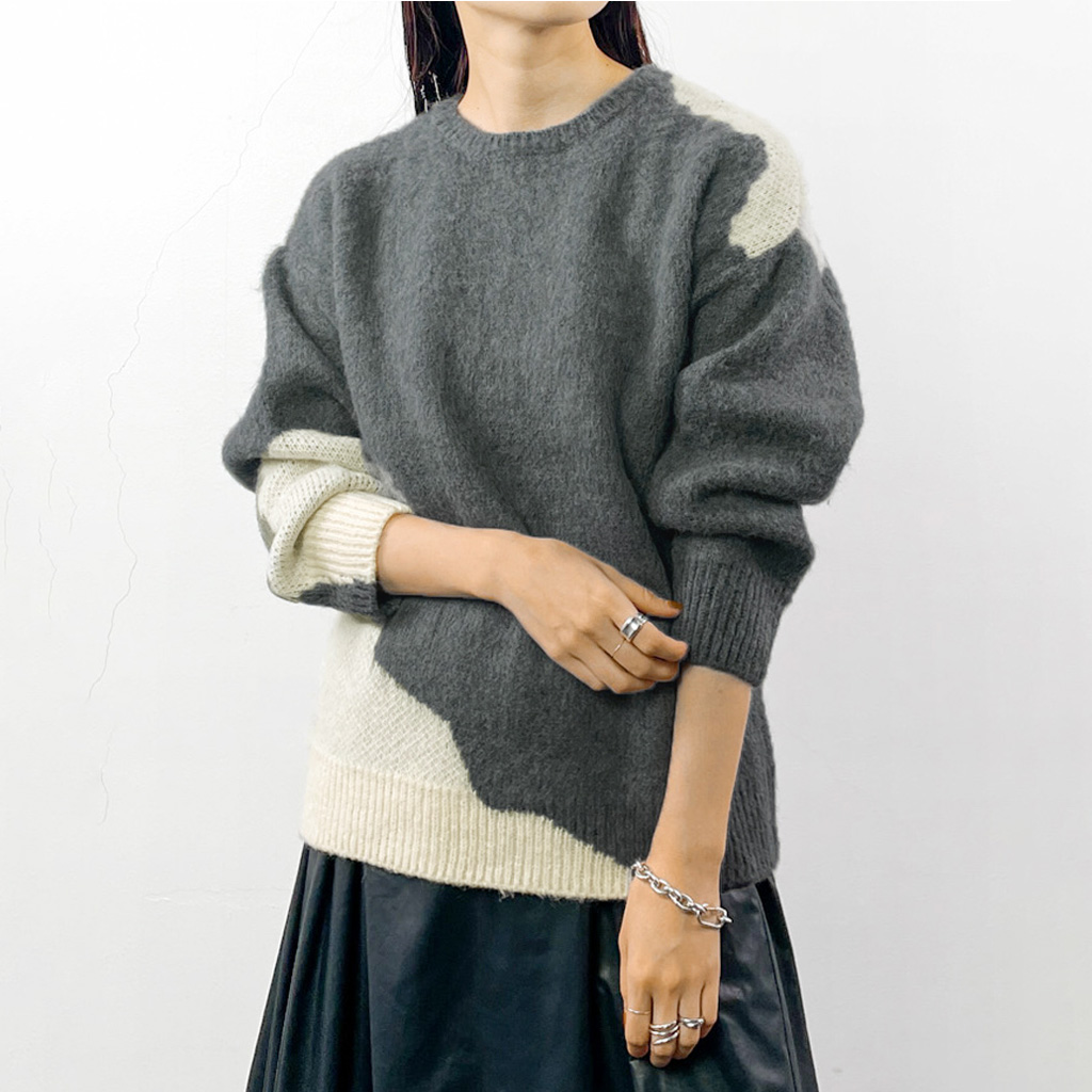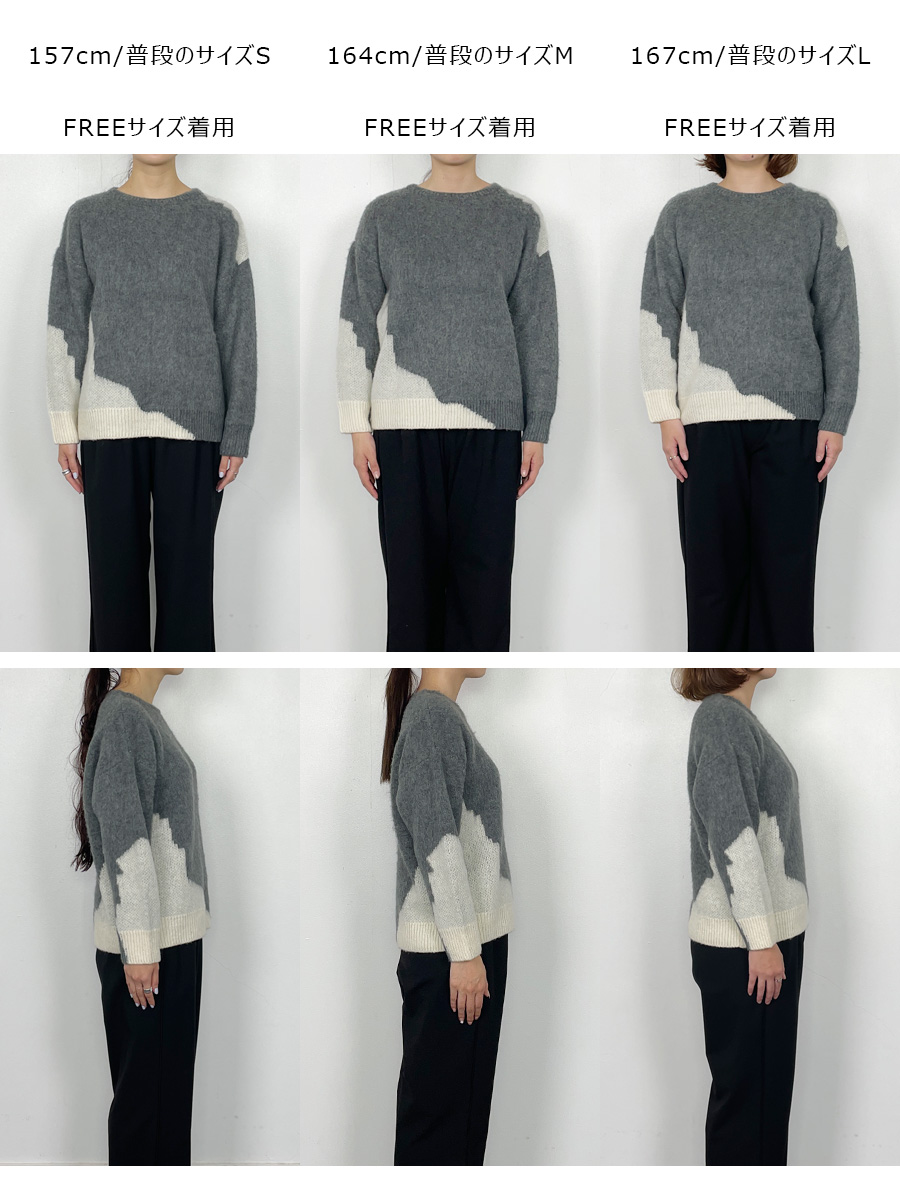 ※セール品は不良品以外の返品・交換不可 ▶Insta Liveでもご紹介しています (6:26~) 柔らかく上品な素材で表現したオリジナル柄が特徴のシャギージャカードニット。 カラーは『グレー/ネイビー/ブラック』の3色展開。 ジャカードでオリジナル柄を表現したシャギーニット アルパカ混の糸を起毛加工し、柔らかで上品な表面感に仕上げました。 素肌に着用してもチクチクにしくい着心地。 1枚で着映えるニュアンスニット 裾や袖などに施した、配色のさり気ないニュアンスの柄で、柄物をあまり着ない方でも取り入れやすく、モードな雰囲気で着られるバランスに。 お手持ちのアイテムと合わせるだけでコーディネートが決まります◎ 程よくゆったりとしたサイズ感で、ワイドパンツやフレアスカートなどを合わせてもバランスが良く、コーディネートに困りません。 中にカットソーを重ねて裾や首元からレイヤードを見せるスタイリングもおすすめです。