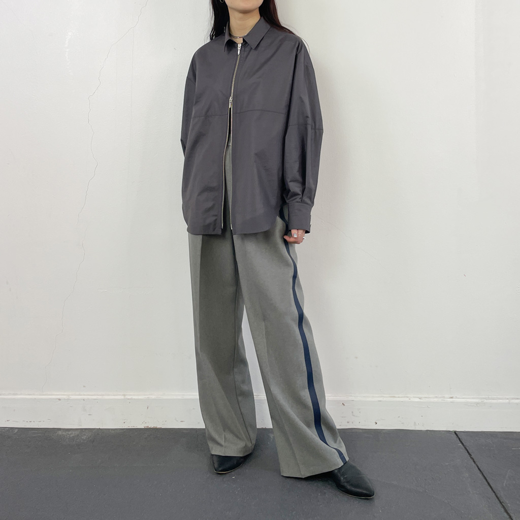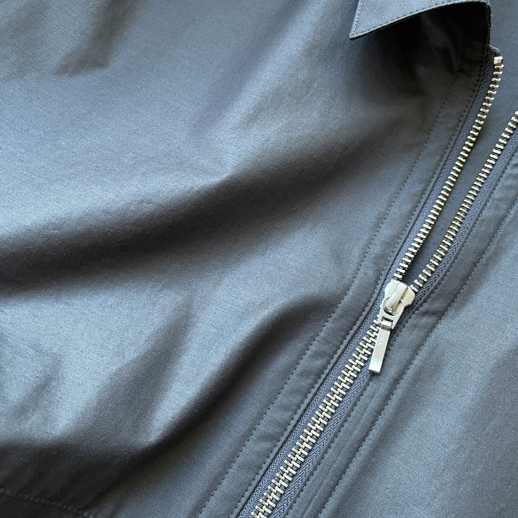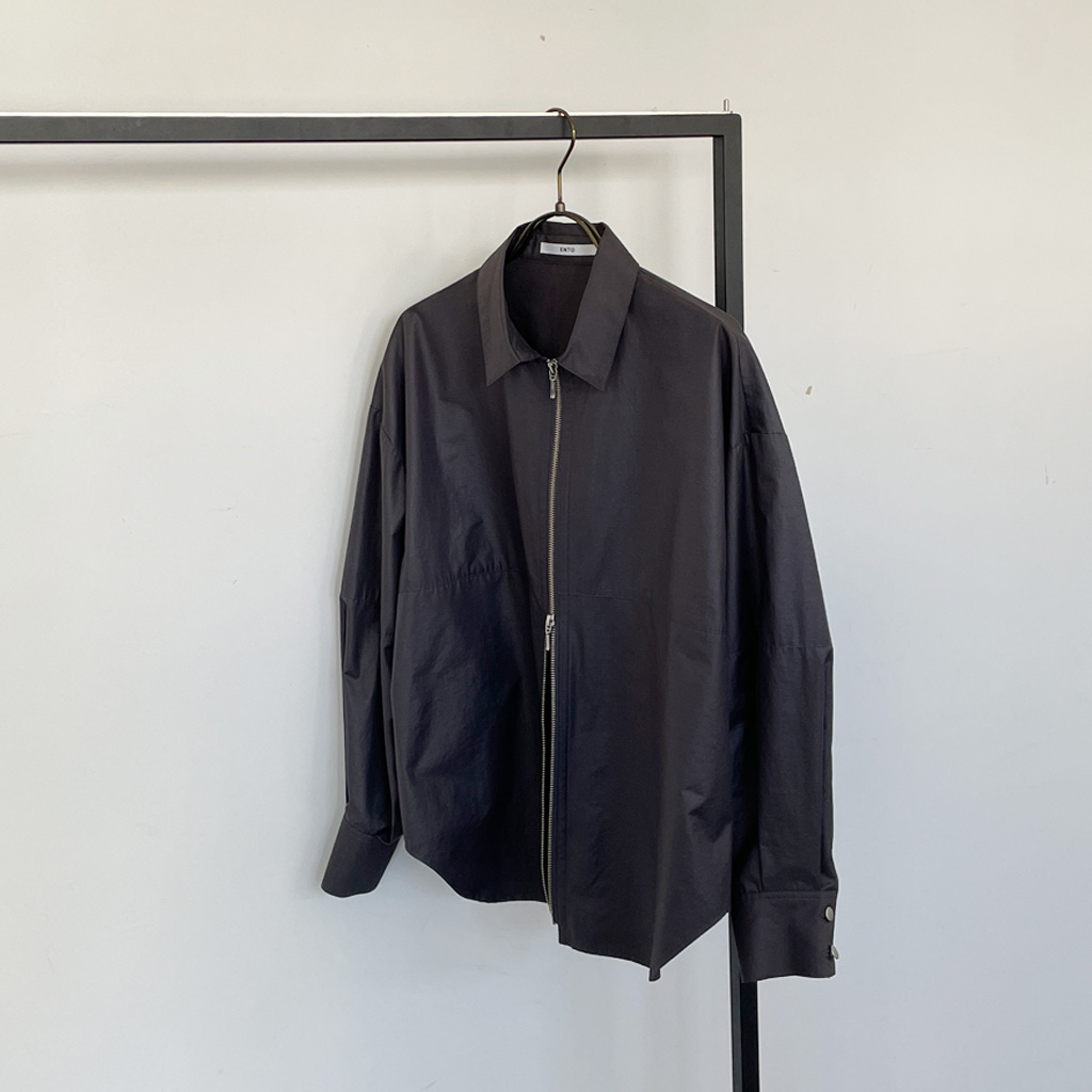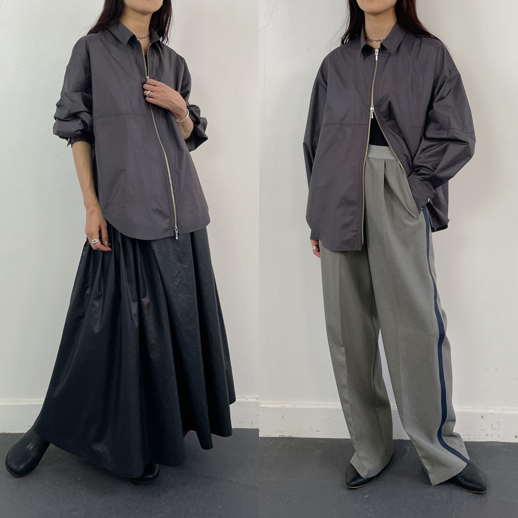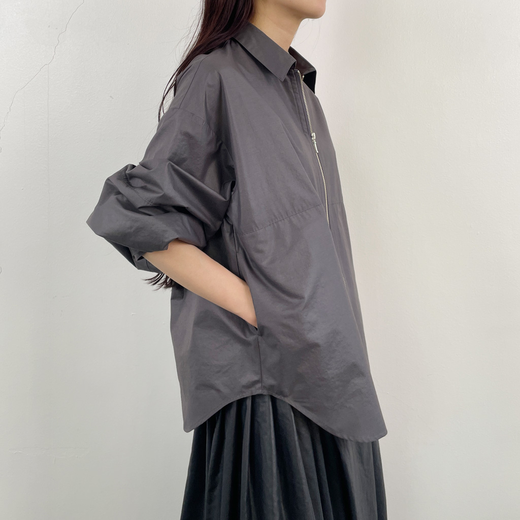 微光沢で上品見えする素材を使用し、大人カジュアルに仕上げたZIPシャツブルゾン。
