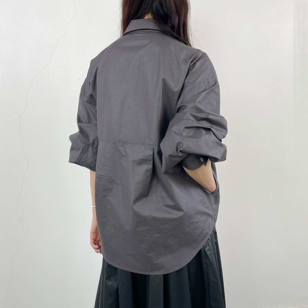 カラーは『チャコール』の1色展開。 シャツ地に上品な微光沢見えする加工を施した素材 タンブラー仕上げをすることで、高級感のある風合いになり、光沢とカジュアル感のバランスのとれた素材。 さりげなくポケットがあるのも便利で、サイドの裾はカーブデザインになっているのでインしなくてもすっきり見え◎