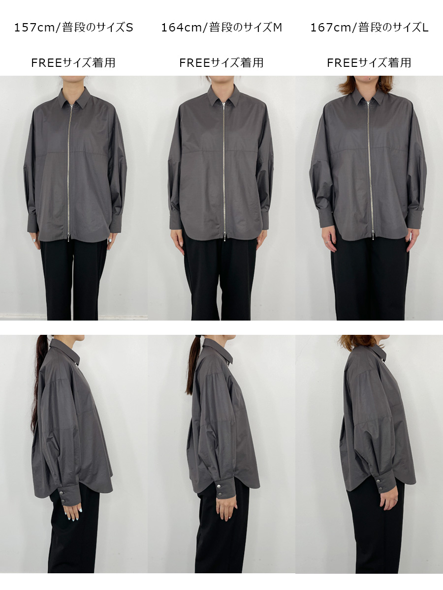 またWファスナーでアレンジを楽しめます。 背面は、ENTO品番のノーカラーシャツジャケットと同じようなタック仕様で、ふんわりとしたシルエットが特徴。 スカート合わせでカジュアルダウンしても、パンツ合わせでマニッシュにも、いろいろなスタイルを楽しめる1着です。