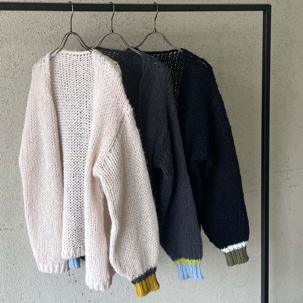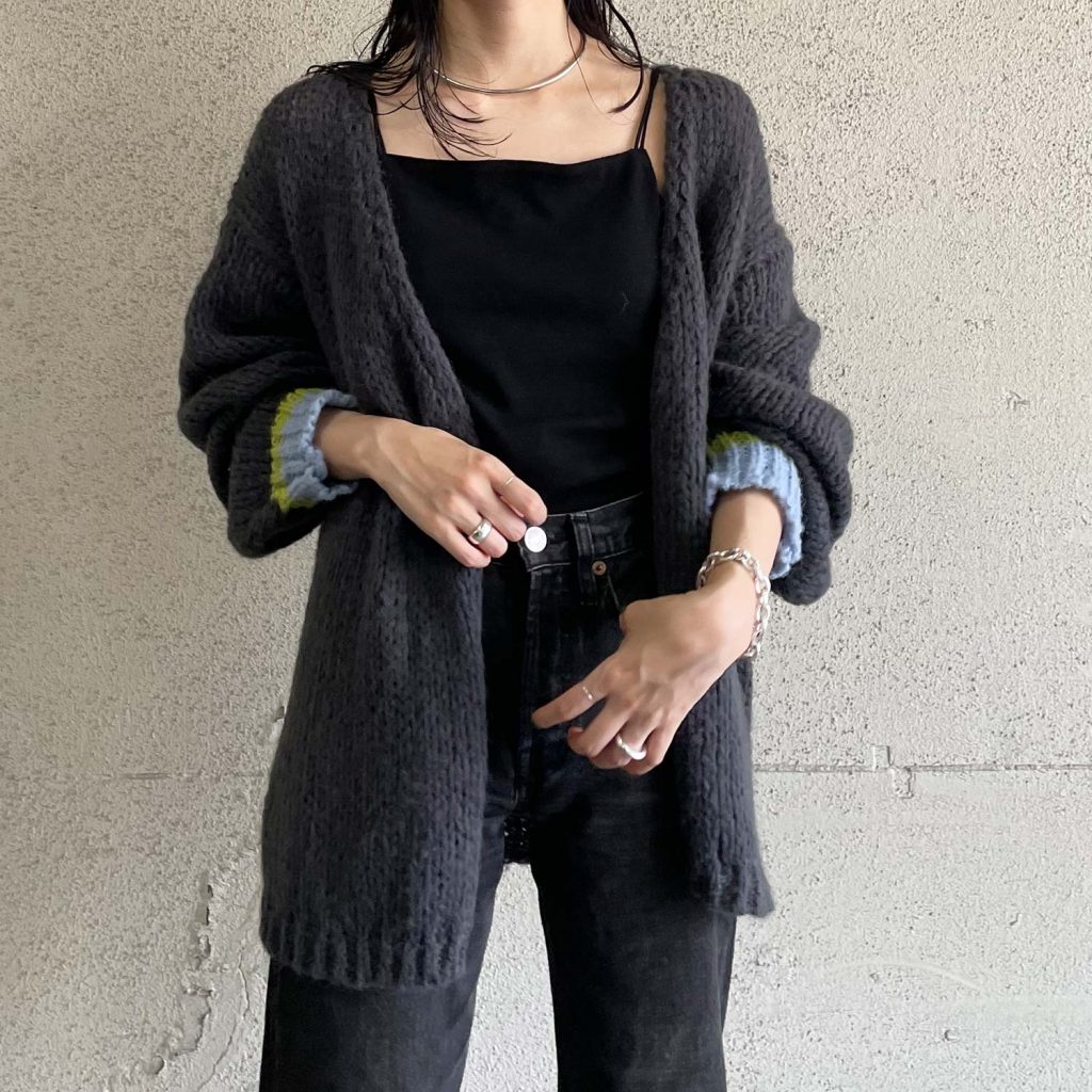 柔らかで軽く、ルーズなローゲージカーディガン。袖口の配色ラインがポイントです。