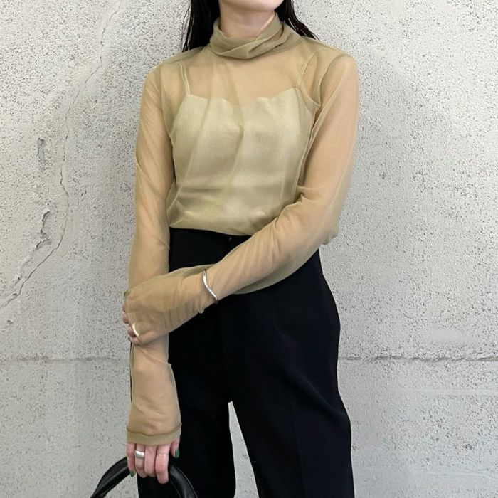 1枚でも着られるように程よい透け感と膨らみ感が特徴で、上品で女性らしいハイネックプルオーバー。