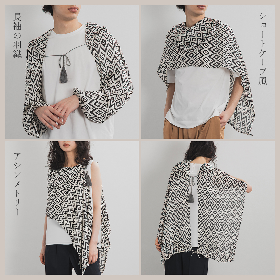 シャリ感のある涼しげな素材。大胆な伝統柄は、シンプルなモノトーンコーデはもちろん、鮮やかなカラーに合わせてもユニークな印象に。柄の出方には個体差があり、一点一点表情が異なります。