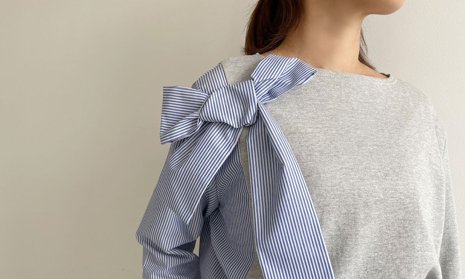 肩のリボンモチーフがキュート!ストライプシャツをドッキングしたデザインプルオーバーが登場!