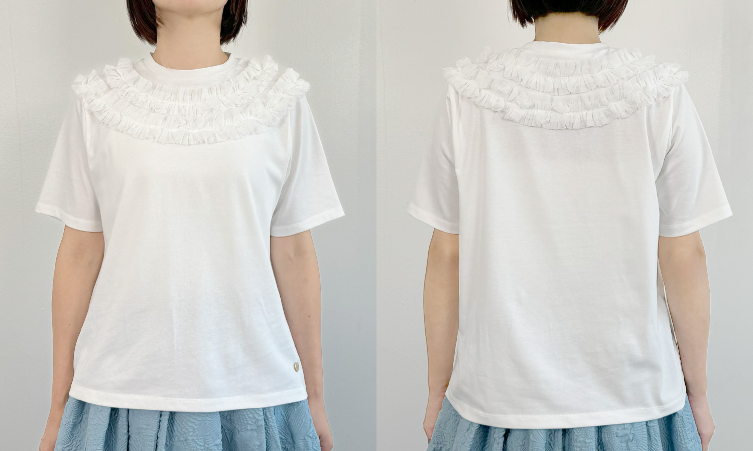 05ホワイト 05ホワイト 99ブラック 99ブラック 99ブラック 05ホワイト 99ブラック 05ホワイト 画像拡大 トレンド感のある大人可愛いチュールデザイン 【50%OFF】デコルテチュールフリルTシャツ 商品番号 TC241L018E 通常価格 ¥ 10,890 のところ 販売価格 ¥ 5,445 税込 [ 54 ポイント進呈 ] color size 05ホワイト 38 お気に入りに登録する カートに入れる 99ブラック 38 お気に入りに登録する カートに入れる ギフト資材(必須) 希望しない(+¥0 税込) ギフト資材を希望する(+¥0 税込) ※セルフラッピング ※1注文につき1点まで ※セール品のため、不良品以外の返品・交換はご遠慮ください。 商品情報 サイズ / 素材 スタッフコーデ レビュー 商品情報 デコルテにチュール素材のフリルがデザインされた、大人可愛いデザインTシャツが登場! Tシャツなのにブラウス感覚で着用いただける1枚で着映えするデザイン。 お顔回りを華やかに演出してくれアクセサリー不要のアイテムです。♡♡ 1枚でコーディネートを華やかにクラスアップ フリル部分はボリュームが出すぎず、細かいギャザーを入れる事で動きのあるデザイン。 どの角度から見てもデコルテラインに沿って1周グルっとフリルのデザインが施されており、目を惹くアイテム♡ 計算されたシルエット 二の腕が程よく隠れる袖丈で気になるラインをすっきり見せてくれます。 インもアウトも絶妙な着丈 ゆったりとした身幅でストレスフリーな着心地。 長過ぎない丈感でインもアウトもバランス良くまとまり、合わせるボトムスを選ばずコーディネートしやすいデザイン。 左腰にはトレコードオリジナルのゴールドチャームも付いており、ワンポイントに◎ 生地の薄さ:普通 透け感:ホワイトあり 伸縮性:あり 裏地:なし サイズ サイズ 着丈 身幅 袖丈 フリー 約57cm 約50cm 約22cm ※商品を置いて測ったときのおおよそのサイズです。商品により多少の誤差が生じる場合がございます。 素材 コットン 72% ポリエステル 24% PU 4% フリル部分 ポリエステル 100% 原産国 韓国 スタッフ試着コメント 身長165cm、普段の着用サイズM。 デコルテに施されたチュールフリルがとても華やかでエレガント♡ 身頃と同系色のチュール素材ので派手になり過ぎない奥ゆかしさもあり、これぞ大人可愛いの代名詞的なTシャツ! どんなコーディネートでも合わせやすく色々と考えるのが楽しい1枚。 × サイズガイド この商品を使ったコーディネート 2025/07/21 2025/07/21 167cm ☆Miki☆ ミキ CLOCHE POPUP CLOCHE 167cm 2025/06/15 2025/06/20 153cm 福家 愛 フケアイ CLOCHE POPUP CLOCHE 153cm 2025/06/16 2025/06/19 157cm みやもと ミヤモト CLOCHE office CLOCHE 157cm 2025/05/22 2025/05/22 153cm 福家 愛 フケアイ CLOCHE POPUP CLOCHE 153cm 2024/08/23 2024/08/23 167cm ☆Miki☆ ミキ CLOCHE POPUP CLOCHE 167cm 2024/07/09 2024/07/17 167cm ち ひ ろ チヒロ TRECODE office TRECODE 167cm お客さまのレビュー RECOMMEND ITEMこの商品におすすめな商品 神戸・山の手セミシアースカート 12,100円(税込) 神戸・山の手エンボススカート 12,100円(税込) 【30%OFF】サイドパールスキニーデニム 9,240円(税込) 【30%OFF】ランダムドット撥水フレアスカート 13,090円(税込) ストレッチサイドリボンパンツ 15,400円(税込) 一緒に見られているアイテム
