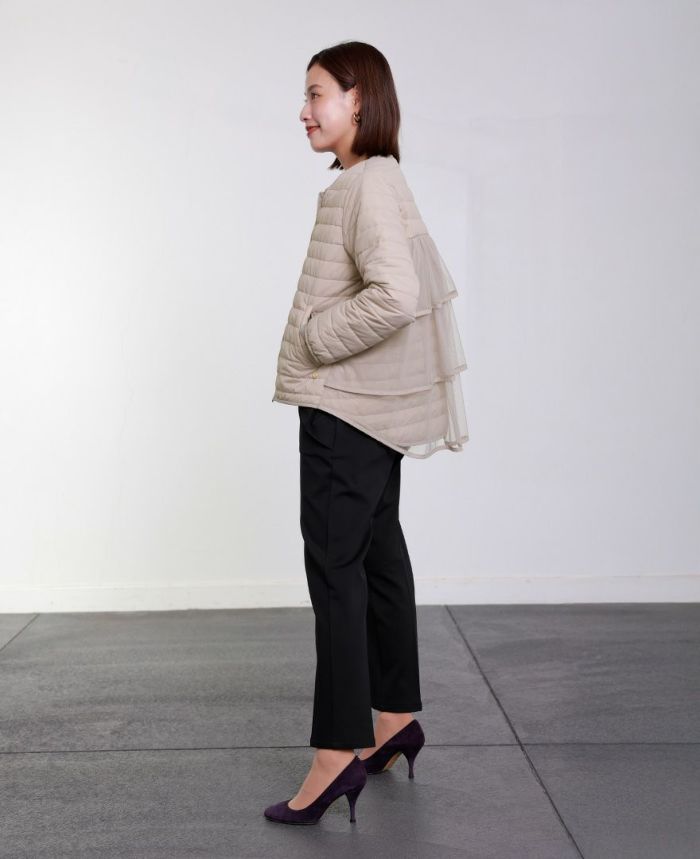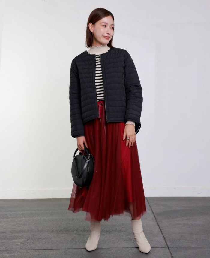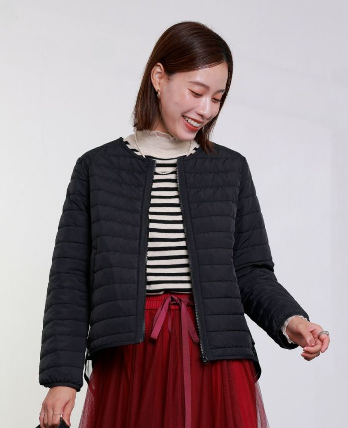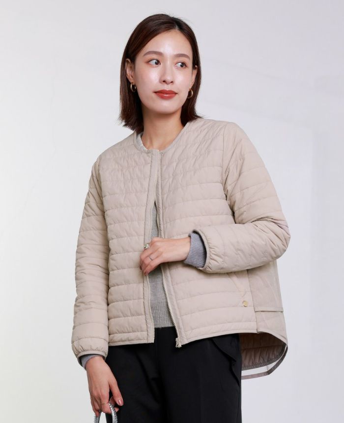お手持ちのどんなトップスでも合わせていただけるように首元はノーカラーに。