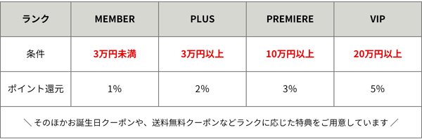 会員ランクは当年2月~翌年1月の1年間のご購入金額に応じて毎年2月上旬に更新されます。