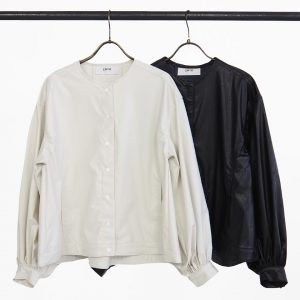 ノーカラーシャツジャケットにロンTをレイヤードさせ、ボトムスはレザーパンツを合わせてベーシックカラーでまとめて少しメンズライクに。