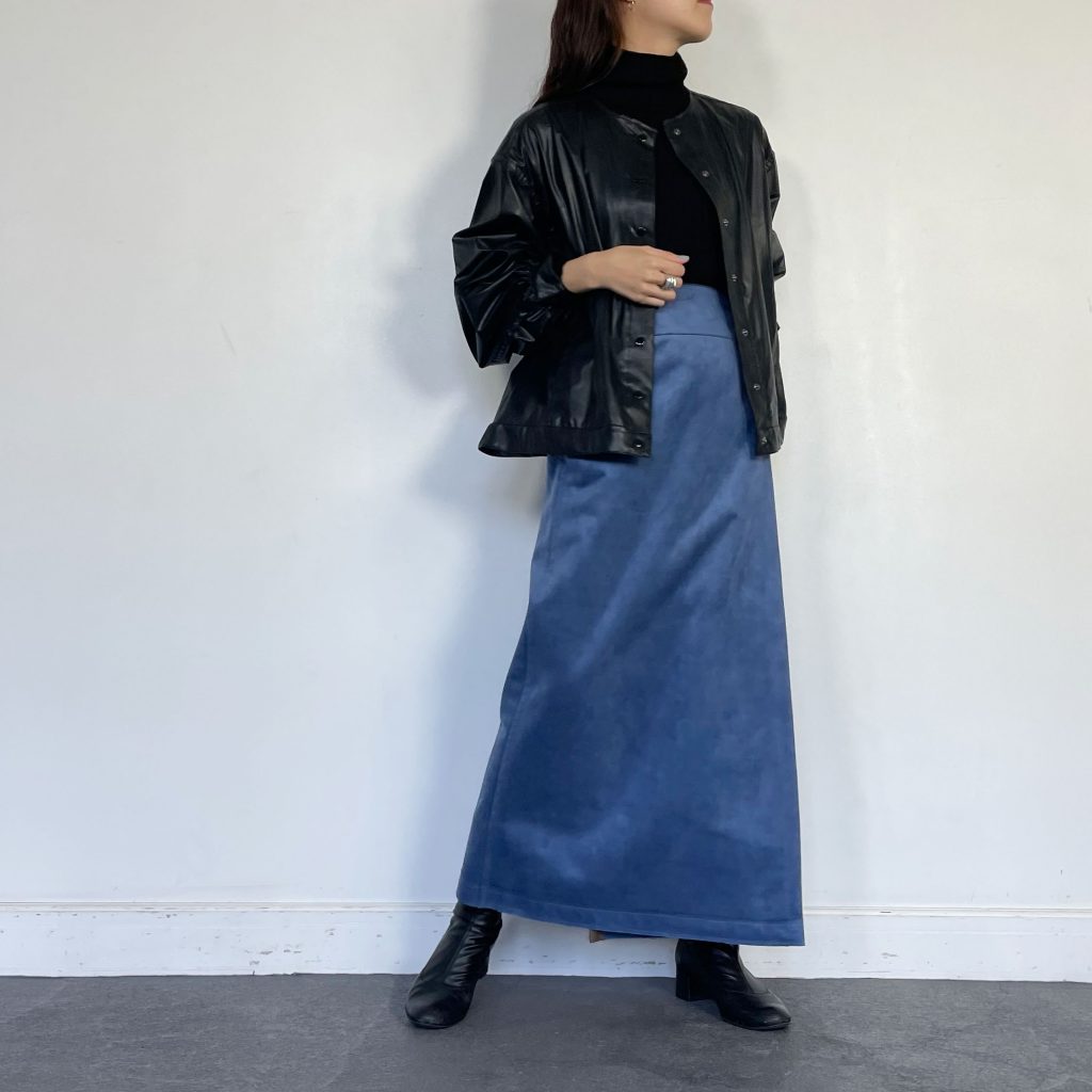 レザーやスエード素材の季節感あるアイテムを取り入れながらも、アウターのインナーはワイドリブのハイネックを合わせて寒さ対策も忘れずに◎