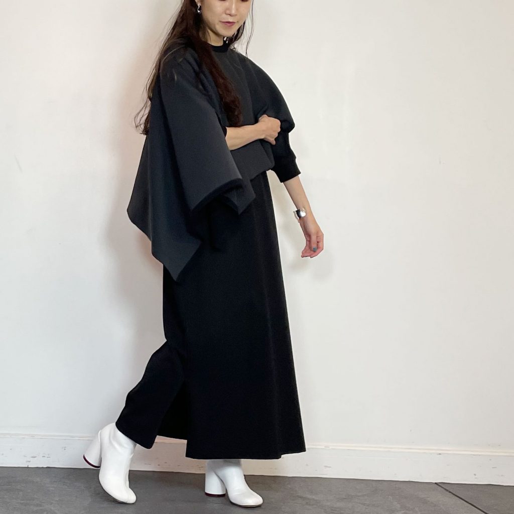 カジュアルなカットソーワンピースにアシンメトリーデザインのポンチョをアウター使いで、スタイリングに差をつけたコーディネートに。