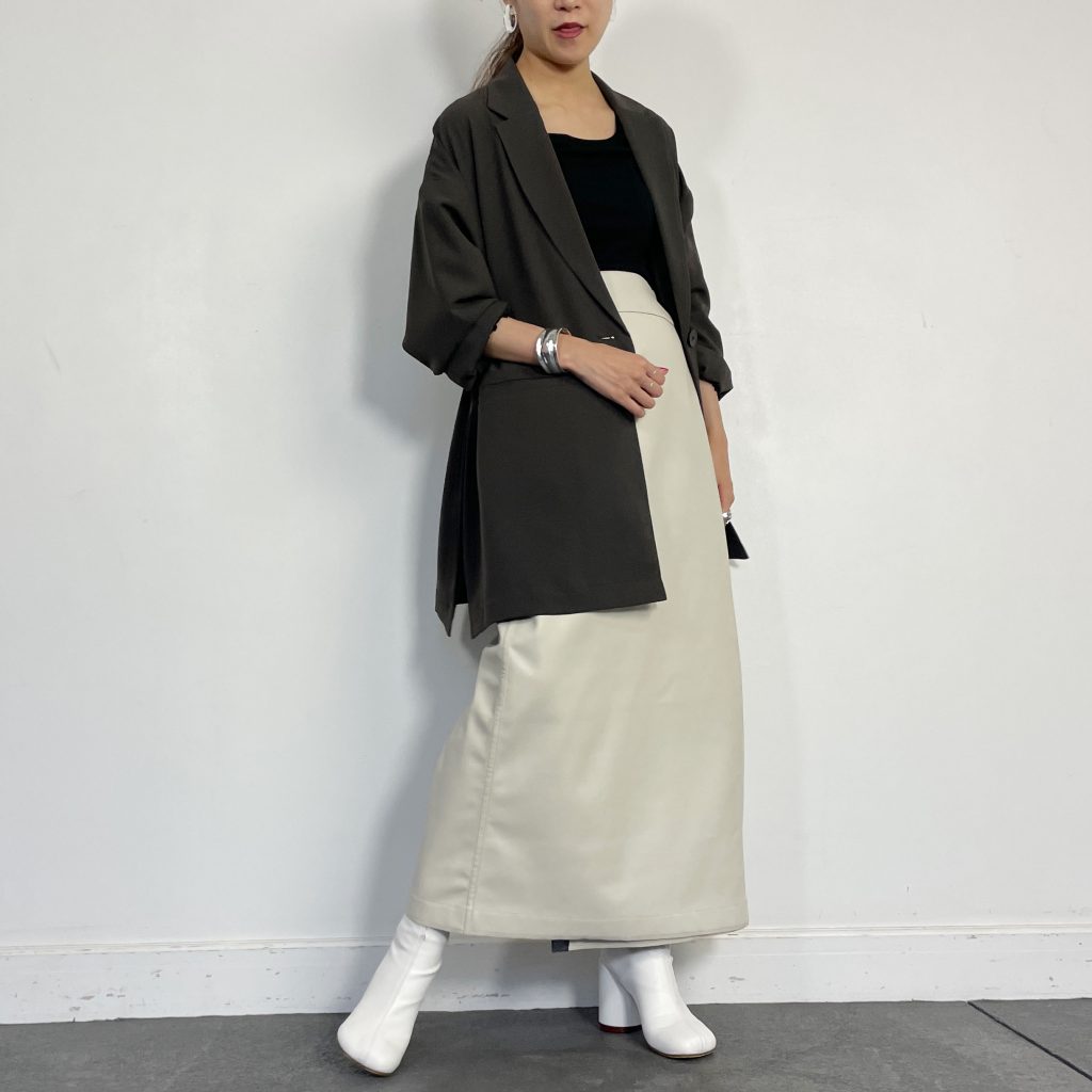 アイボリーカラーのエコレザースカートに、コンパクトなトップスをインすることでスタイルアップ効果◎