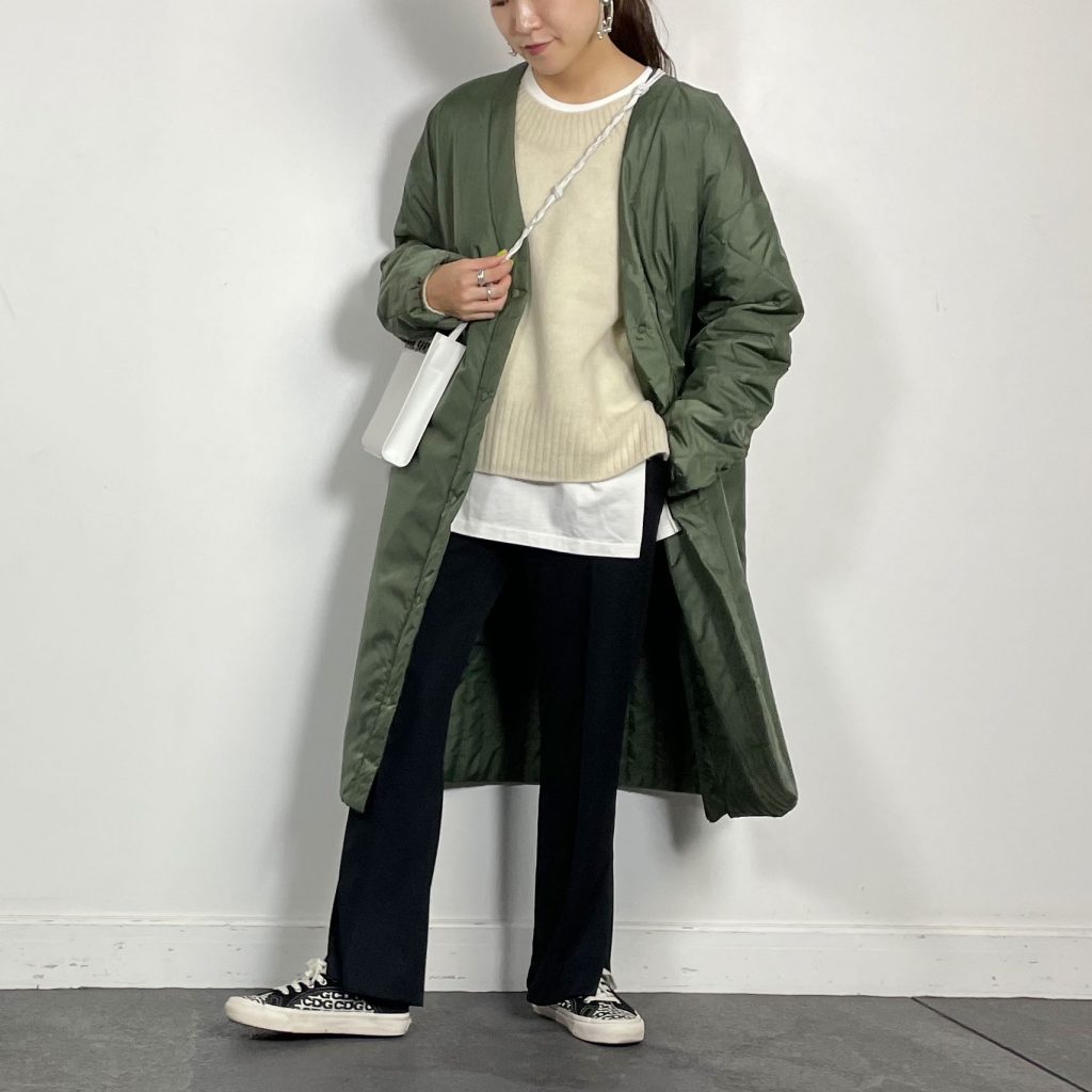 ニットにロンTを重ね着しボトムスにはリブパンツと、カーキカラーのノーカラーキルティングコートを羽織ったカジュアルコーデネート。