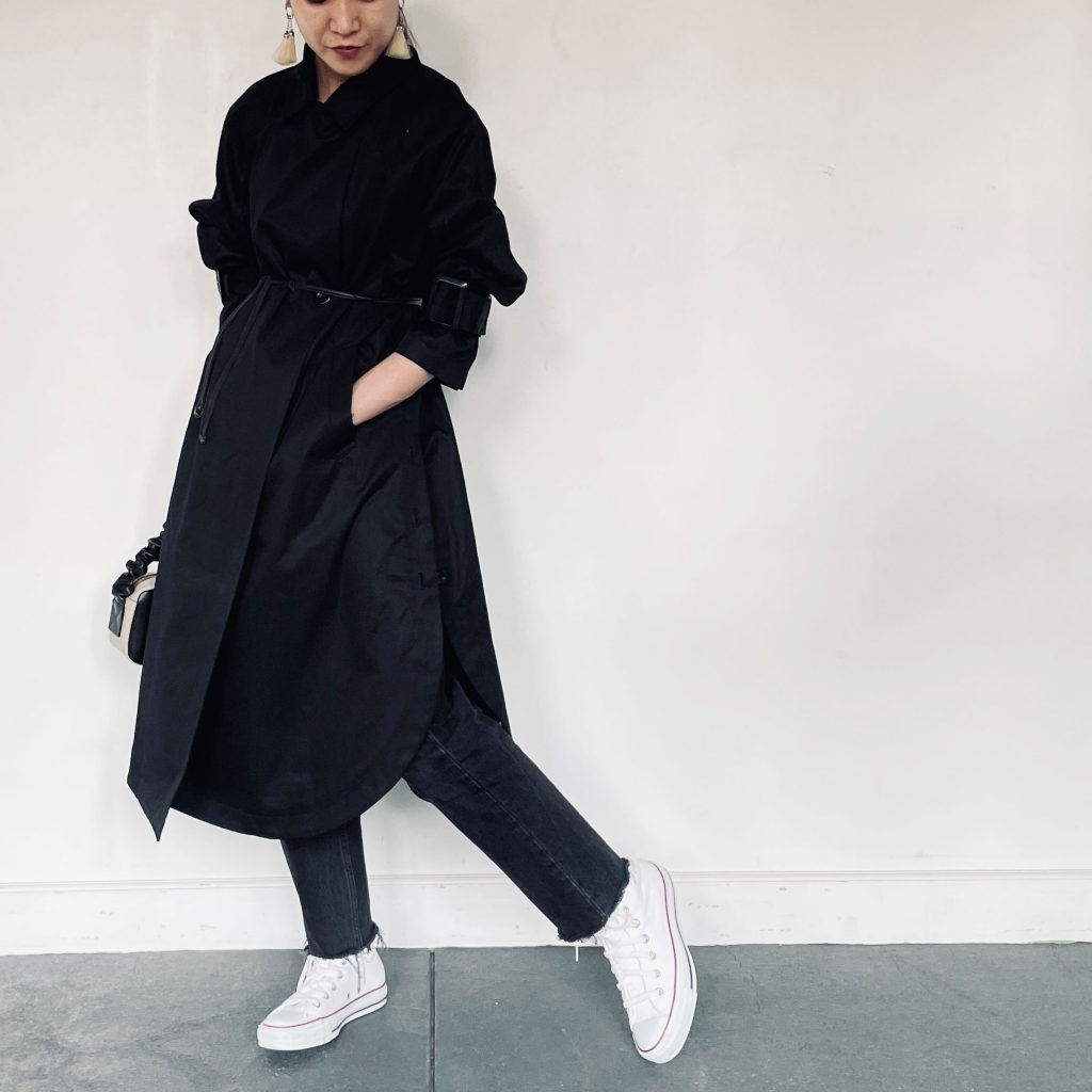 トレンチコートをベルトでウエストマークしたアレンジコーデは、スニーカーとデニムのカジュアルな組み合わせでも、オーバーサイズのコートにメリハリがつきスタイルup&カチッとした小物合わせでキレイめに仕上げました◎
